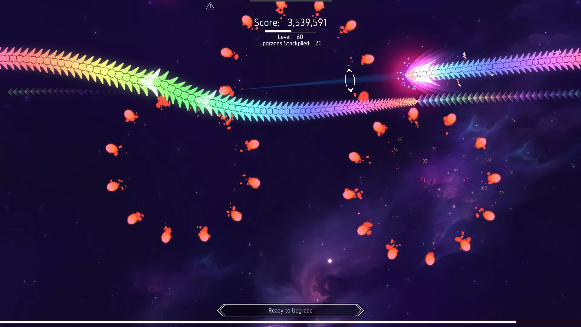 为何它如此强力 在游戏后期,这套构筑拥有600以上的船体值(生命值条实际上比屏幕宽度还要长)、60以上的回复、5以上的装甲以及60%以上的伤害减免,几乎是无敌的存在。伤害也极为爆表,任何触碰到蛇形船体的敌人都会立即死亡。 比如当你处于雷区,或是被大量天族单位和锤头鲨包围时,飞船的船体值几乎不会有太大变化。 在第400波之后,只有这4种敌人可能会杀死你,前提是你非常不小心。
