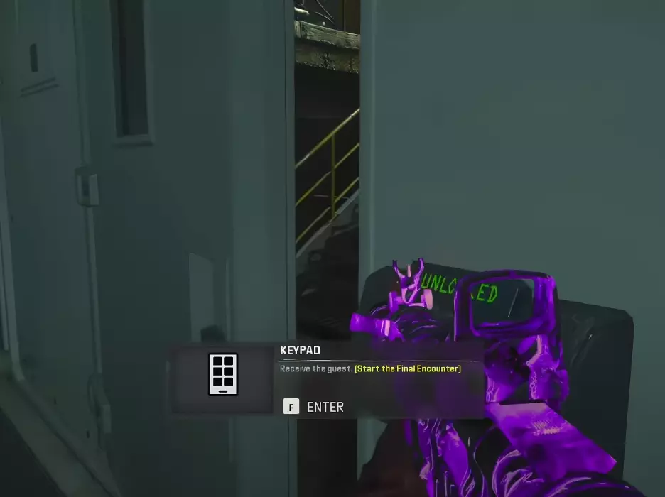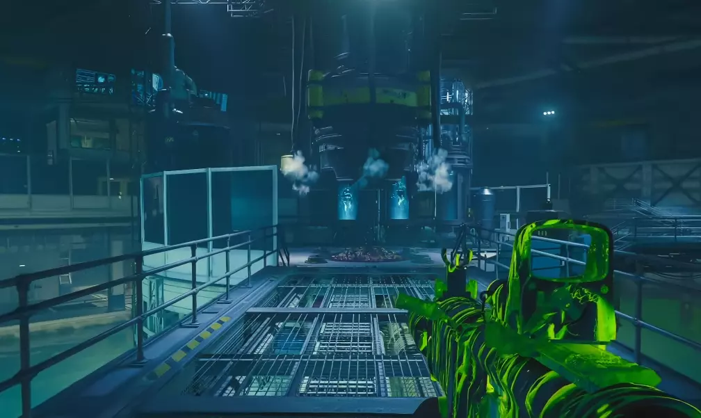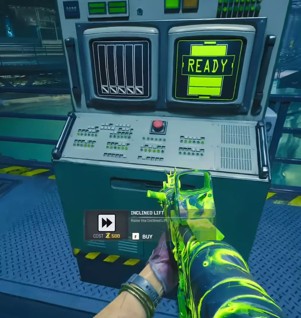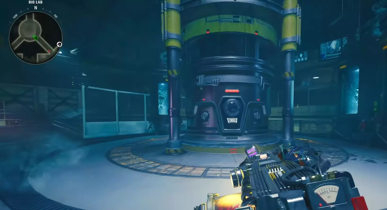 第一步 - 打开研究室 使用位于 Pack-A-Punch 机器对面的控制台,乘坐带有 Pack-A-Punch 的电梯上楼。