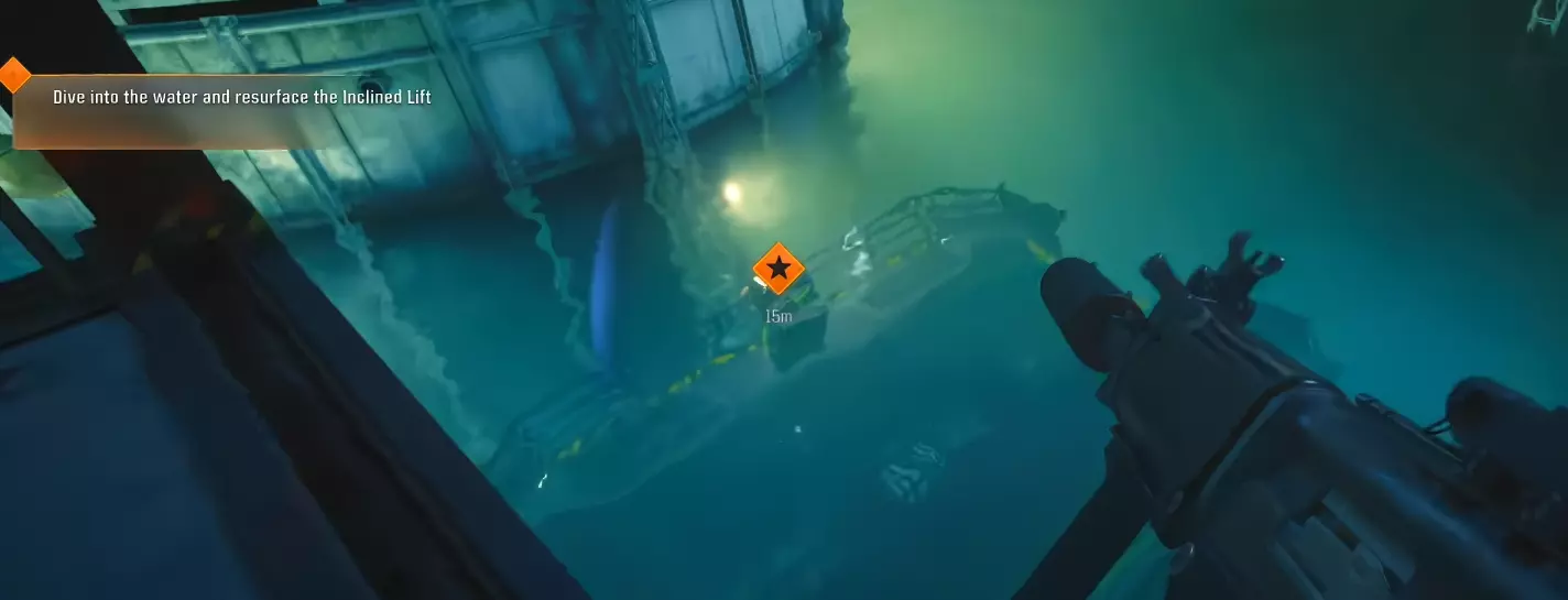 在桥底下,潜入水中并捡起钥匙卡