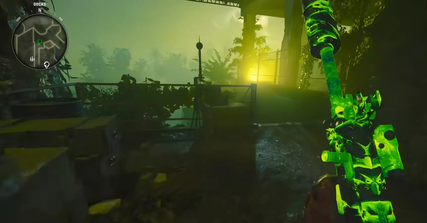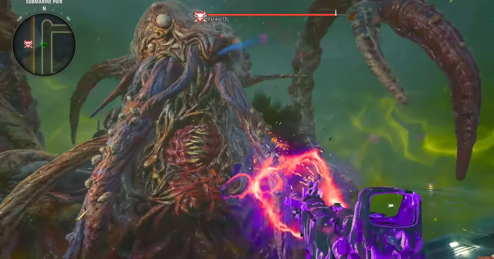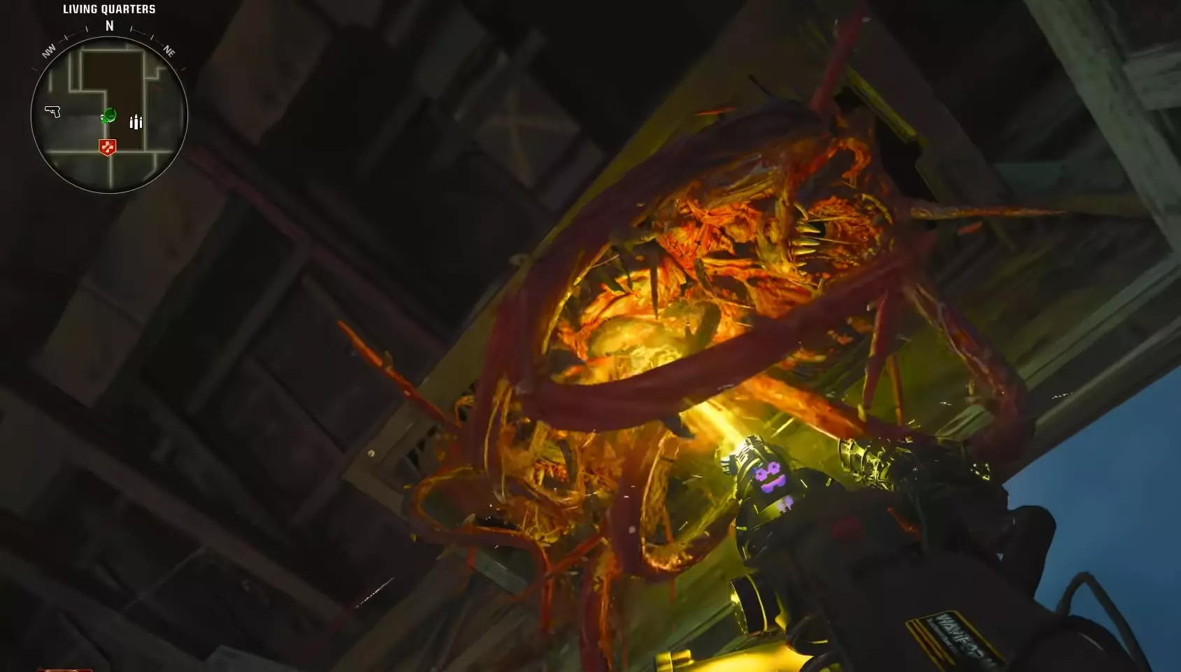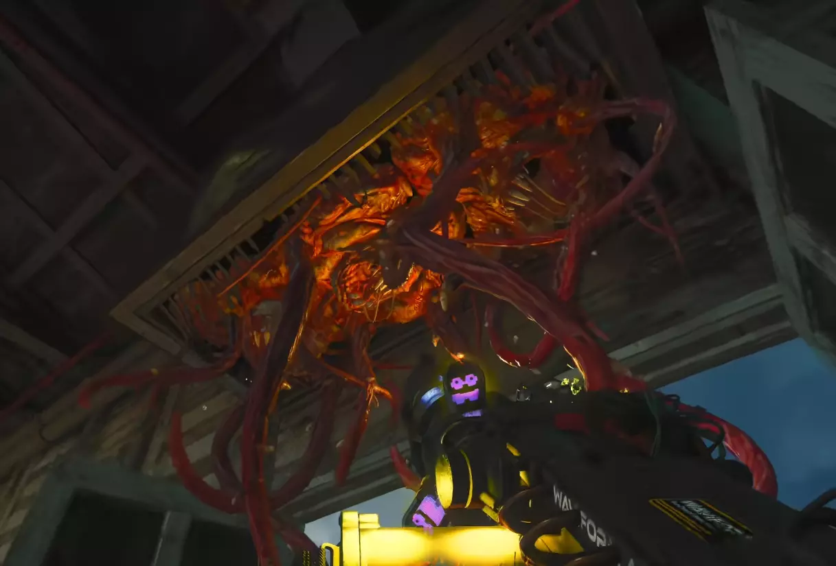 开始 Boss 战之前,建议携带 3 级 Pack-A-Punch( Pack-A-Punch 强化等级 3)的轻机枪或突击步枪,这些武器对 Boss 的伤害最高。 DRI-11-Beamsmasher 对 Boss 的伤害不高,但适合在战斗中击杀一些生成的普通僵尸和精英僵尸。 射线枪(Ray Gun)在战斗中清理僵尸效果不错,但由于武器的子弹速度较慢,造成伤害的速度也较慢。 最后,一些猴子炸弹(Monkey Bombs)和变异注射剂(Mutant Injection)在团队或你遇到麻烦时会很有用。 步骤 6 - Boss 战 一旦投票开始战斗,在战斗前会有一段过场动画。