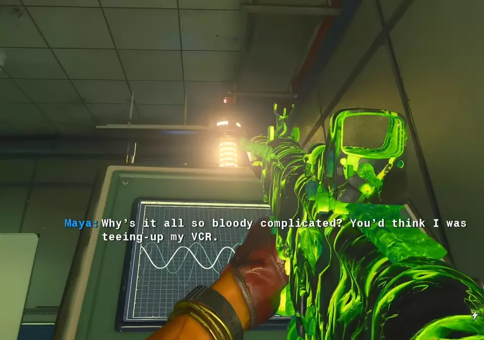 这将触发一段对话。 接下来前往生物实验室。 与中央的物体互动。