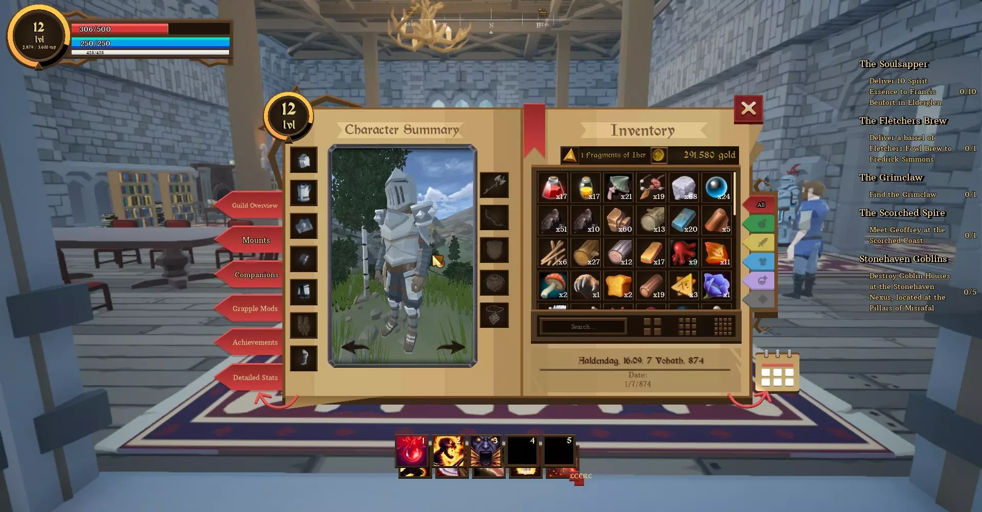 日历 - 显示事件的时间、地点、具体内容以及其将带来的奖励或对世界的改变 世界地图 - 进入全局地图 任务日志 - 任务记录 制作 - 制作箭矢、子弹、小型动物陷阱、睡袋及装饰物品 物品栏 - 存放你的物品、已装备的 armor 和武器,包含以下标签页: 【公会概览】- 公会相关信息(是否加入公会、公会等级及简要描述) 【坐骑】- 坐骑及其召唤功能 【伙伴】- 可携带的宠物伙伴驯服了抓钩模块 - 辅助装备工作模式。钩爪猫 - 能抓住表面并帮助在世界中移动,手枪(位于埃尔德格伦森林,前往埃斯罗斯之阶的洞穴,进入后上桥并启动拉杆,然后前往桥后的塔,其中一张桌子上会有手枪) - 可以射击并造成伤害(无需子弹),魔法水晶(帕福德湖的土匪塔顶层) - 恢复100点魔法值 成就 - 达成条件及相应奖励 详情属性 - 角色技能与能力的详细统计