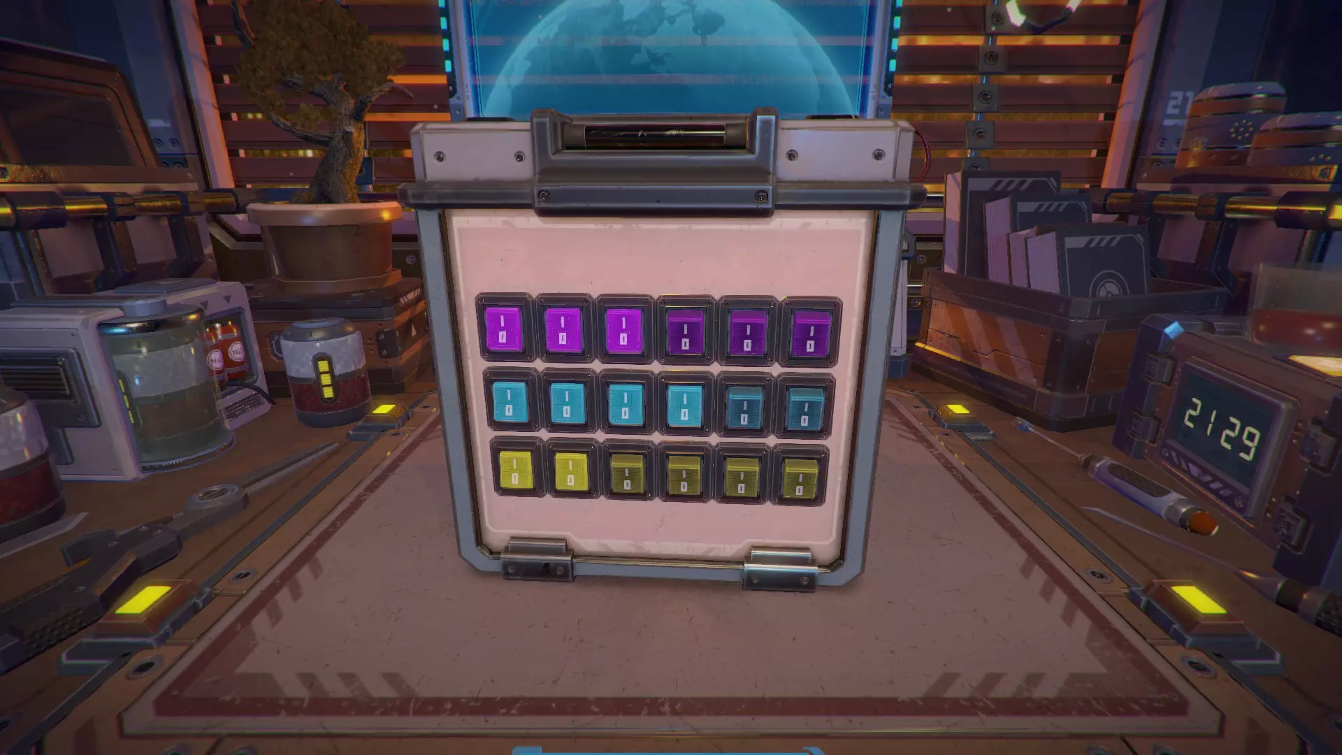 将两个锁的刻度调整到类似时钟显示4点35分的位置。 注意:内侧的圆圈是时针,外侧的圆圈是分针。 第29关 移动锁,直到顶部的指示灯变为单一颜色,然后移动光标来重现该颜色。