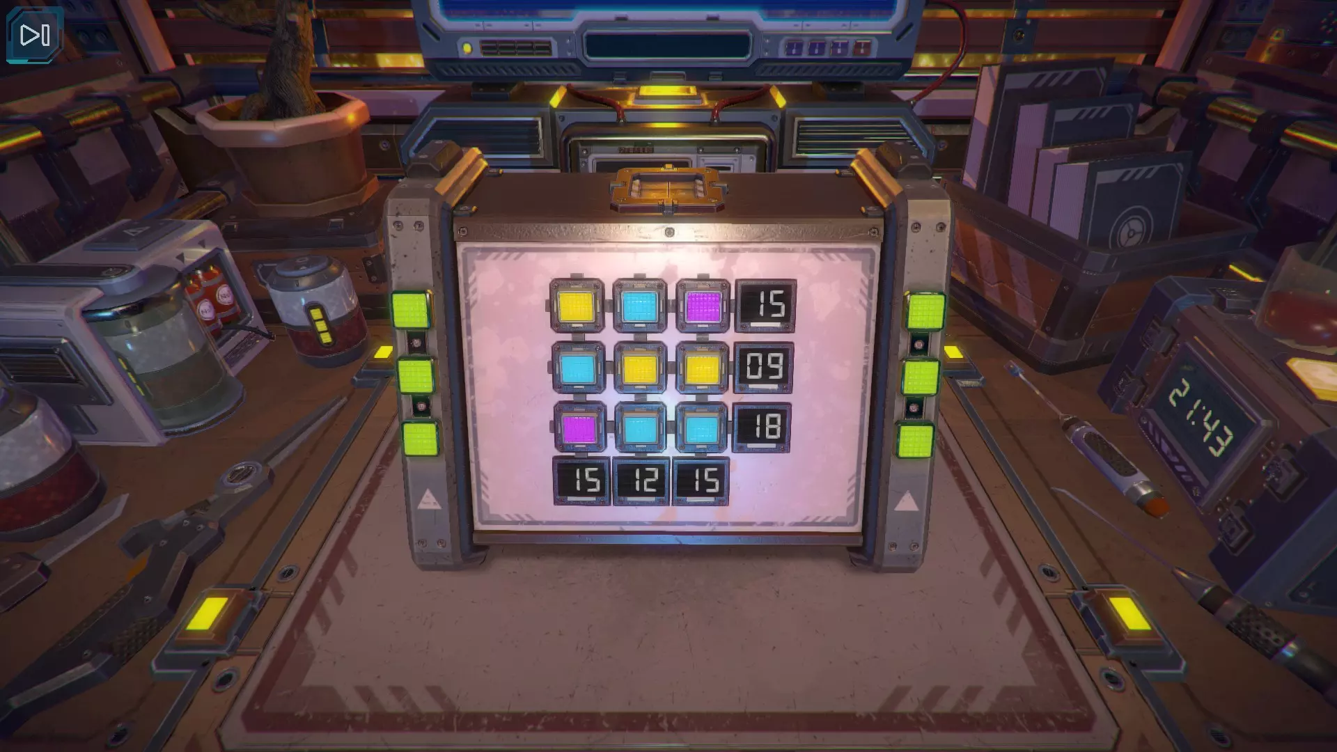 第12关 在立方体的3个面上需要打开小窗口,然后对找到的数字按颜色进行计算。结果需要输入到第4面的显示屏上。 紫色:5 + 7 = 12 蓝色:3 × 5 = 15 黄色:8 - 6 = 2