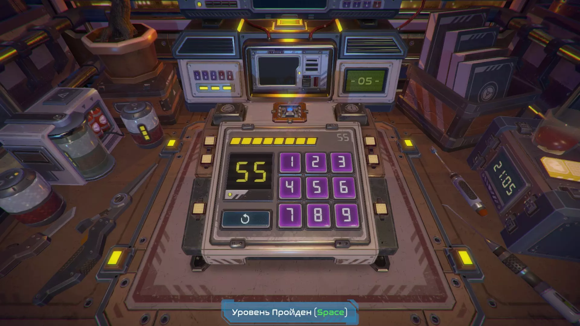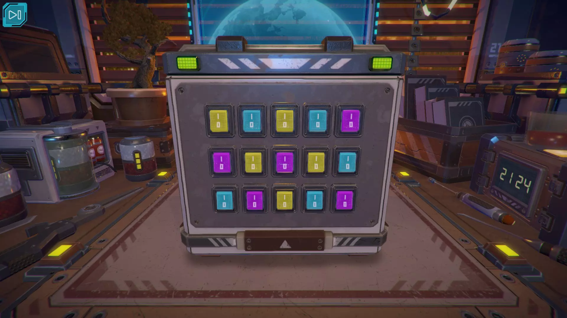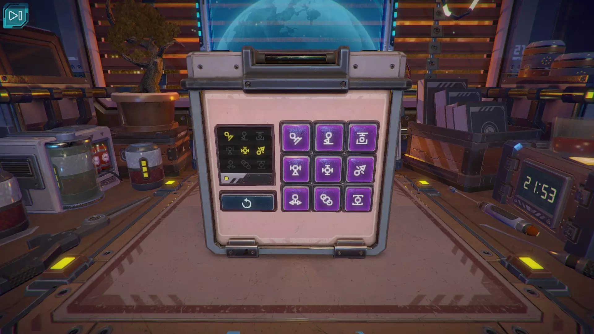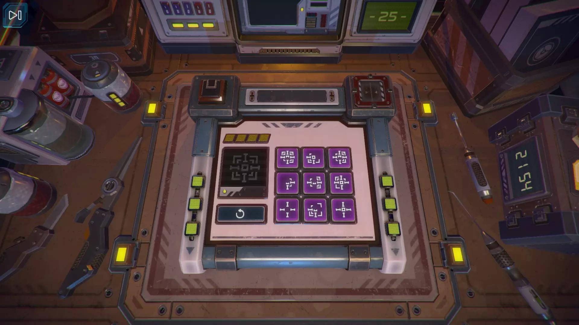 【立方体的下一面】出现了黄色数字9。当第九个黄色指示灯亮起时,按下紫色按钮。