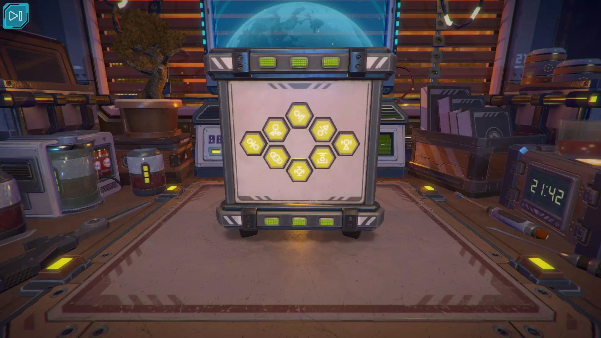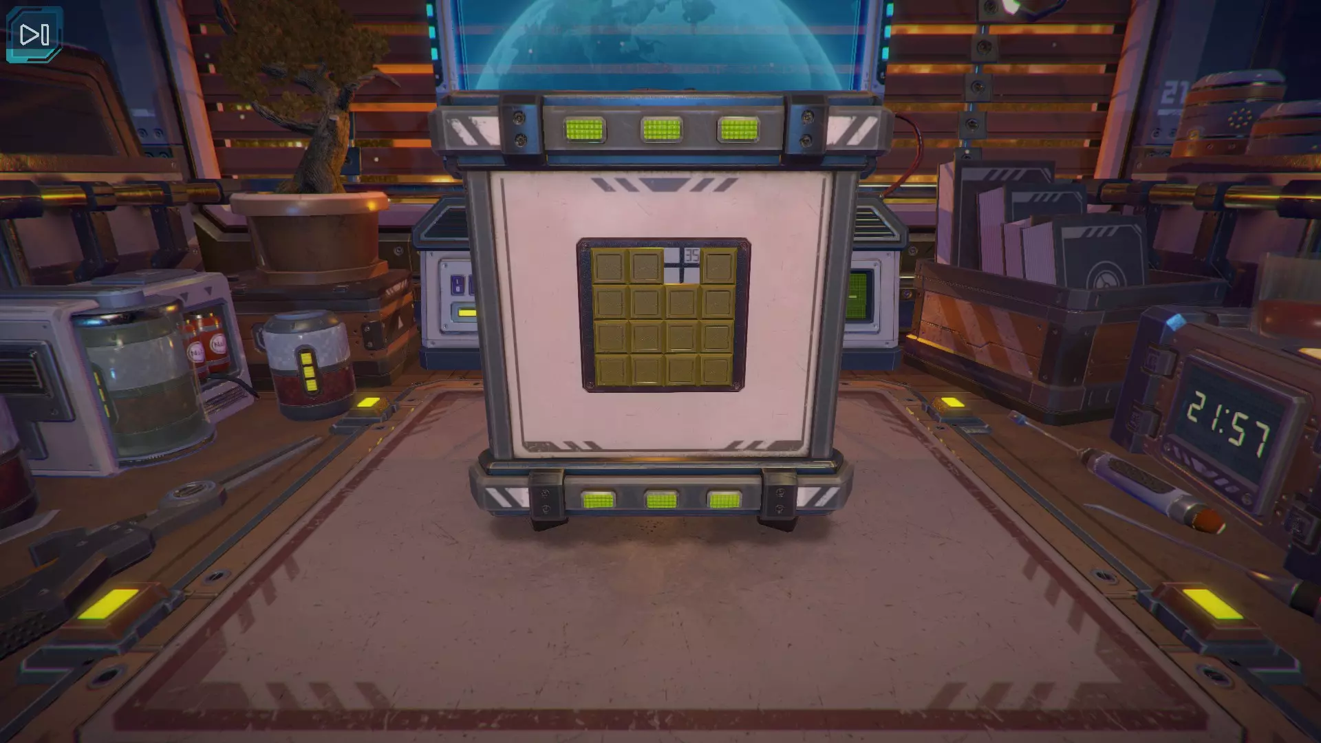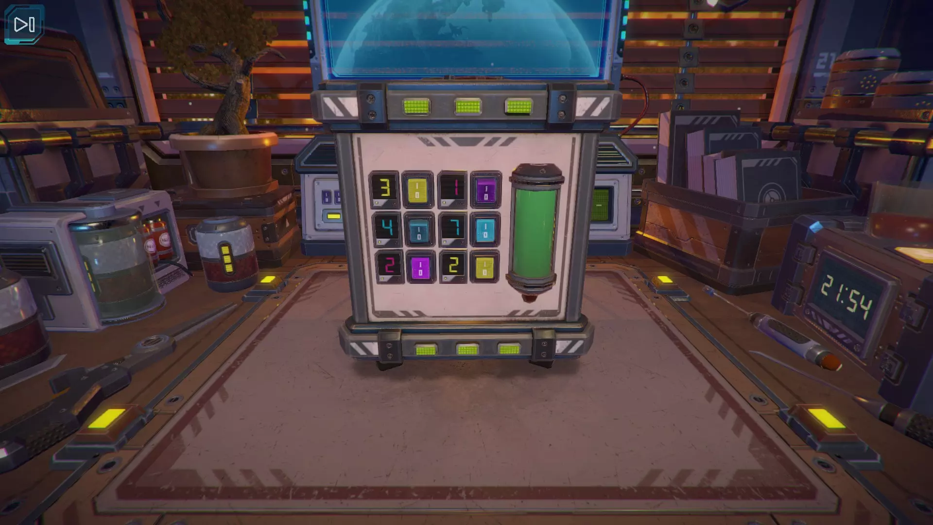 【立方体的下一面】出现了黄色数字9。当第九个黄色指示灯亮起时,按下紫色按钮。