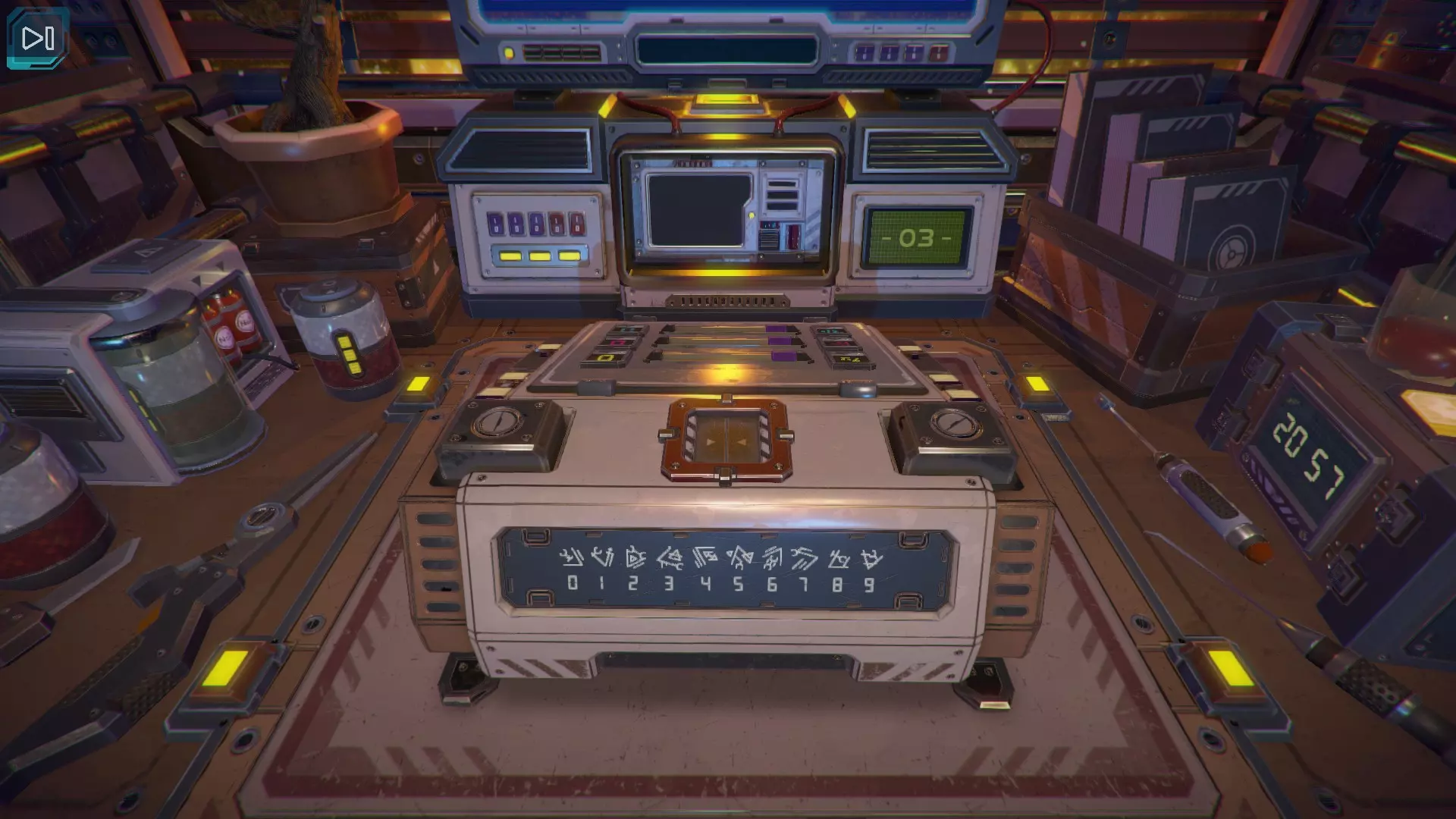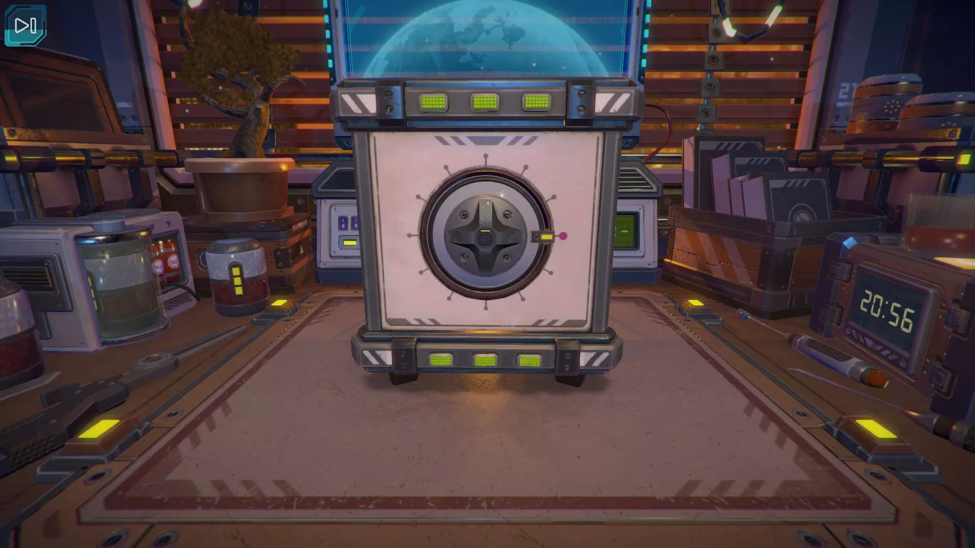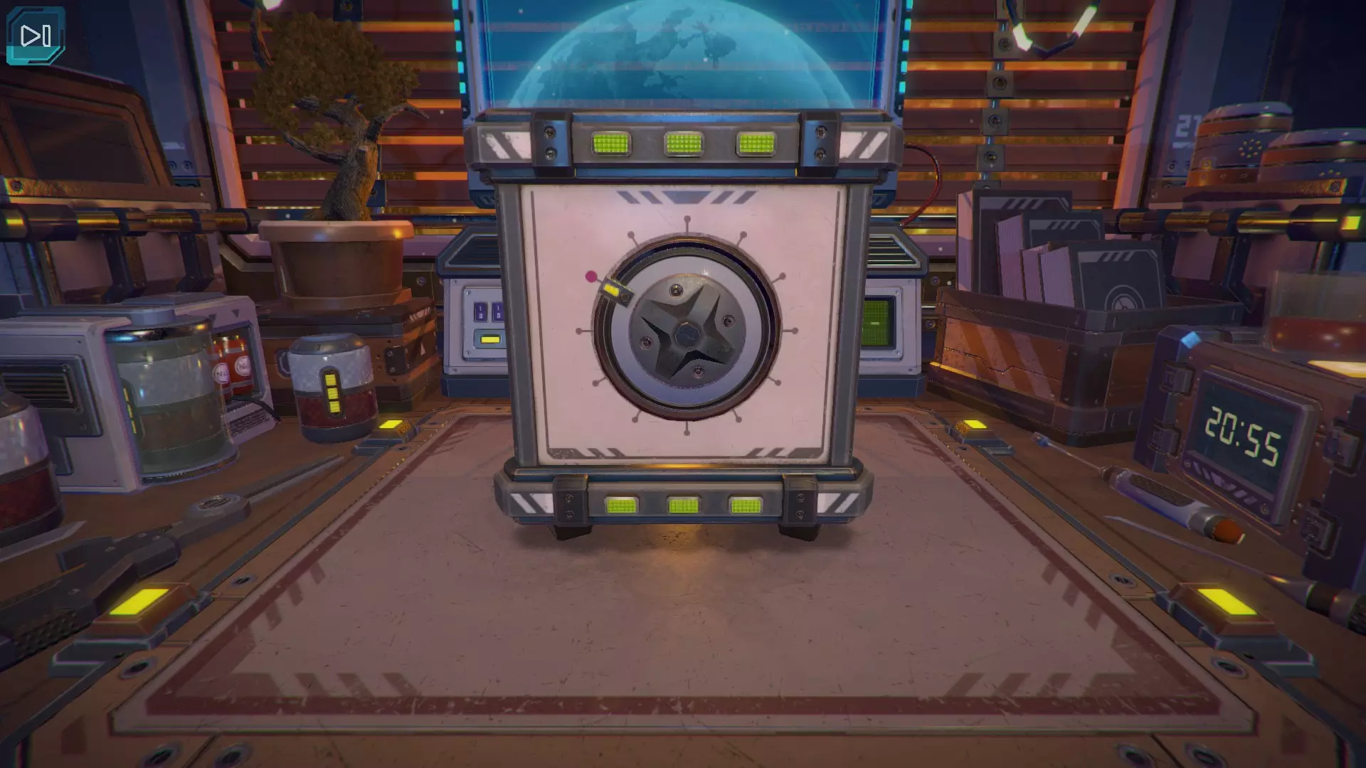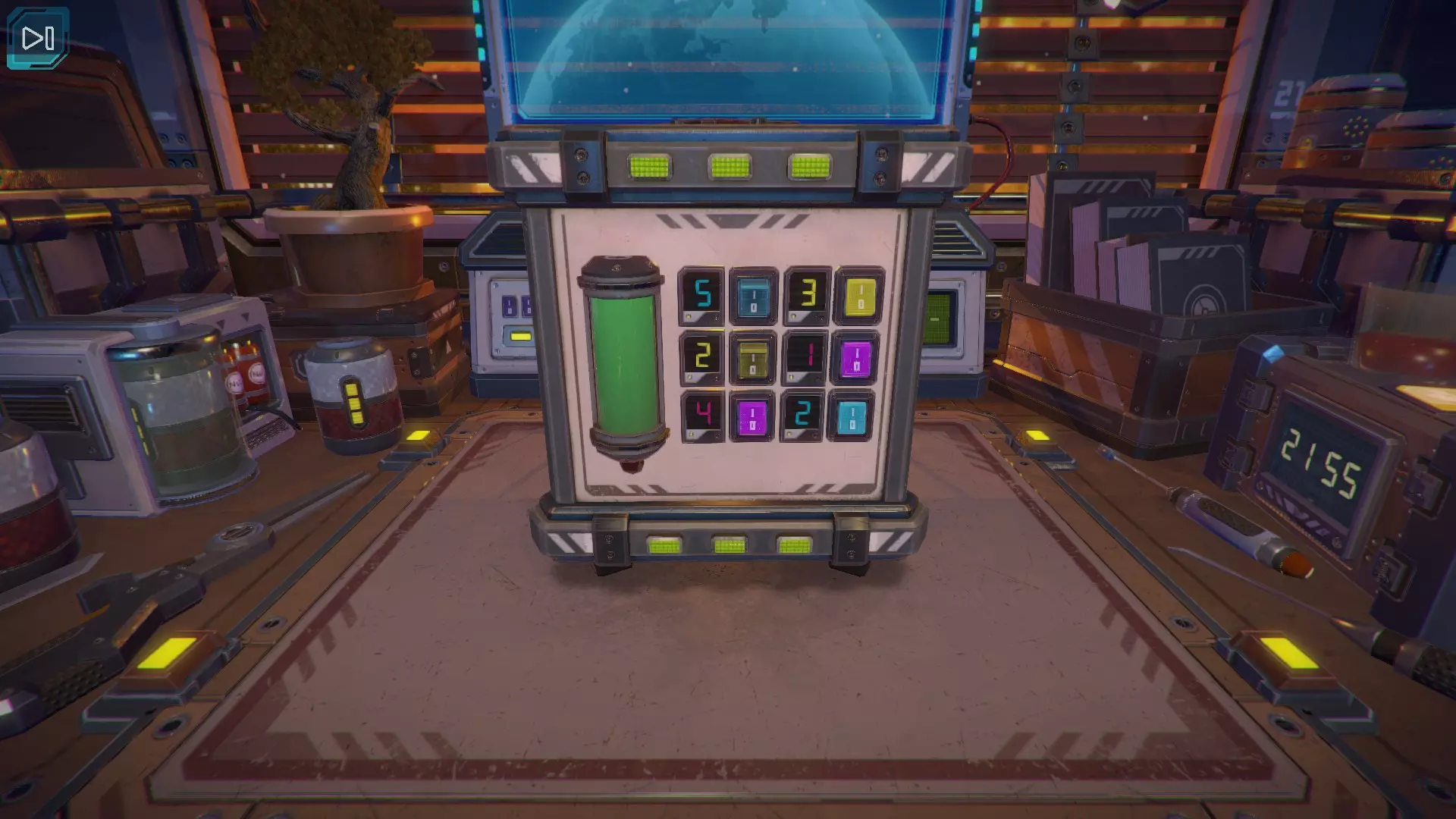 【立方体的下一面】出现了黄色数字9。当第九个黄色指示灯亮起时,按下紫色按钮。