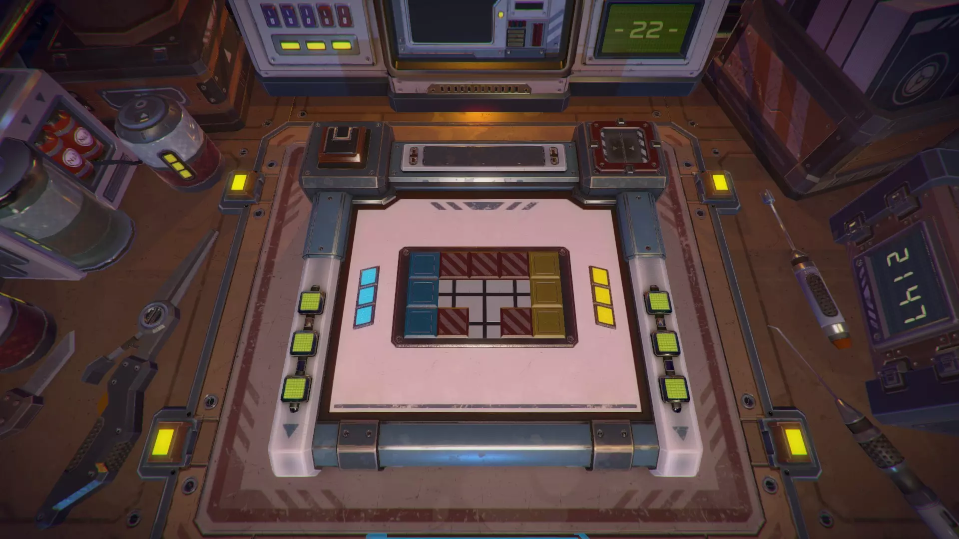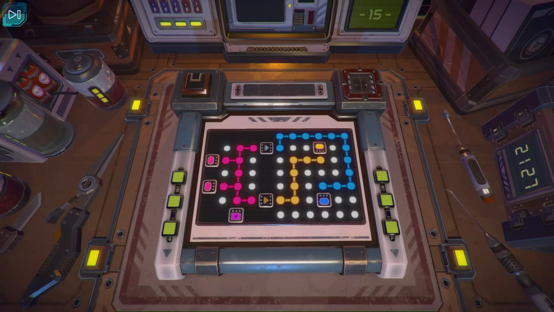 第14关 移动光标,找到与每种颜色对应的数字。当数字消失时,你就会知道那就是正确的颜色。然后,根据该颜色数字消失时显示的数字,按下对应数量的同色按钮。紫色:开启9个按钮 蓝色:开启5个按钮 黄色:开启7个按钮 可以先将一侧的所有按钮全部开启,然后在另外两侧补充缺少的2个黄色按钮和4个紫色按钮。以下是需要完全开启的一侧示例。