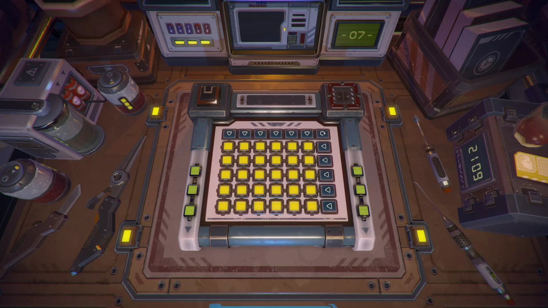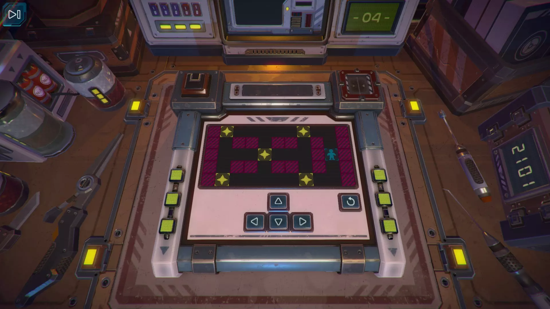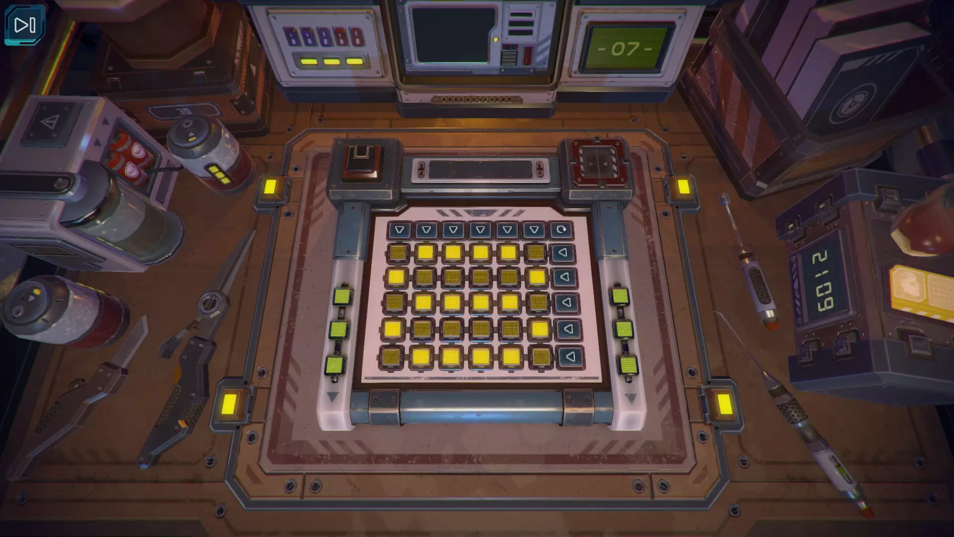 第7关 需要按下共4个按钮: 第一个上箭头; 最后一个上箭头; 右侧第二个箭头; 右侧第四个箭头。