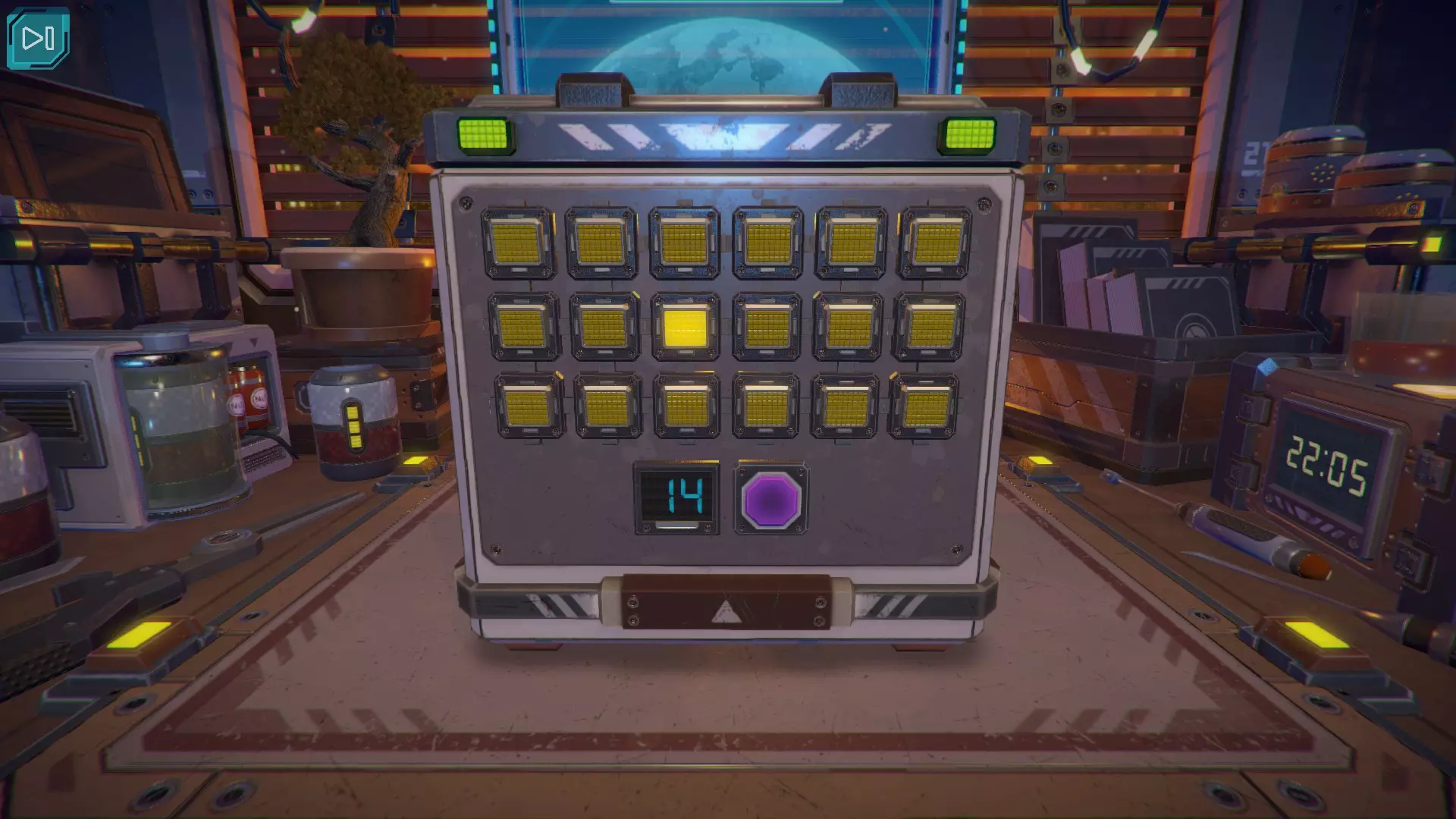 【立方体的下一面】出现了蓝色数字14。当第十四颗蓝色指示灯亮起时,按下紫色按钮。