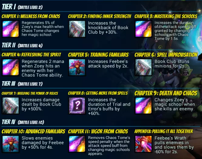 以下是你的选择。该选什么呢?我会给出简短和详细两种回答(给最忠实的佐伊玩家们)。 简短回答:B、G、B、T/B 详细回答: 在2级时,你通常会选择B(第3章)。更高的攻击速度加成意味着更少需要使用技能/消耗法力。 问题在于:如果你不谨慎行事,并且打赌这场比赛会持续到你至少7级(而且你不需要对付生命值极高的小兵),你可以选择T(第1章)来取乐。这样,每次你切换魔法学派时,都能获得一点生命值。有了这个你就能稍微扛一下伤害。 4级时,明显的选择是G(第5章)。菲比的每秒伤害将会翻倍。 T(第4章)可能还行,但你在7级时不会需要那么多法力。B(第6章)就比较一般了。只有在你采用完整的【读书会】流派(这种流派可能很有趣,但强度较低)时,这个才有用。 7级时情况会变得很不错。选择B(第9章),别问为什么。 好吧,我来告诉你原因:你无需为了获得攻击速度加成而消耗法力和法术去对付小规模敌人。此外,你开始几乎能同时释放4种不同类型的法术。你会获得闪电链效果、对所有命中目标的火焰持续伤害、寒冷/冰冻效果以及奥术加成(对加布里埃拉、奥齐尔、“龙矛”臭眼这些友军有效)。你的实用性将提升到一个新的层次。 其他选项则显得有些敷衍。【读书会】流派专属增伤只适用于那种较弱的近战Build,而【反复试验】的持续时间加成则是为误点准备的。在10级时,你唯一的实际选择:当我对抗大量敌人时,通常会选择B(附录),因为它可以将许多小怪拉进你的杀戮区域(当然,前提是它们能在菲比的怒火下存活……)。或者,当我面对生命值较高、不容易被杀死且会深入裂隙的小怪时,可以选择T(第10章)。还记得4级和第5章吗?有了这个,菲比不仅能造成2倍伤害,还能减速一群敌人。这是双赢的选择。