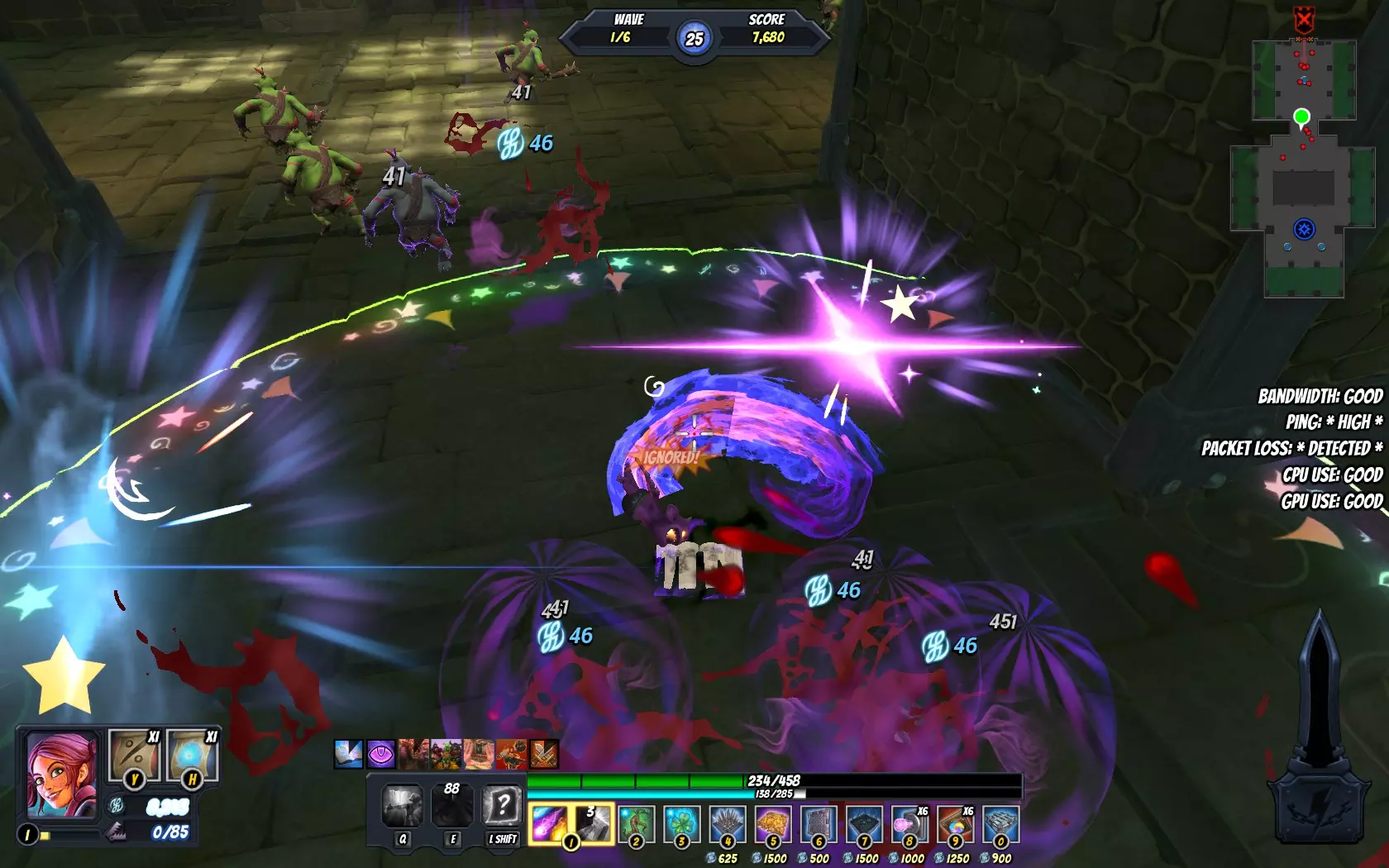 冷却时间:10秒 消耗:40法力值 佐伊挥动书本向右攻击,造成物理伤害并击退敌人(大型仆从仅小幅击退,首领/雇佣兵不会被击退)。若此技能命中目标(仆从、首领、雇佣兵、法杖、不稳定裂隙),她将随机切换魔法学派。 此技能在应对 kobold(狗头人)时效果出色(把握好时机),还能将大量小型仆从击退至边缘、陷阱中或使其远离裂隙。 混乱冲击:
