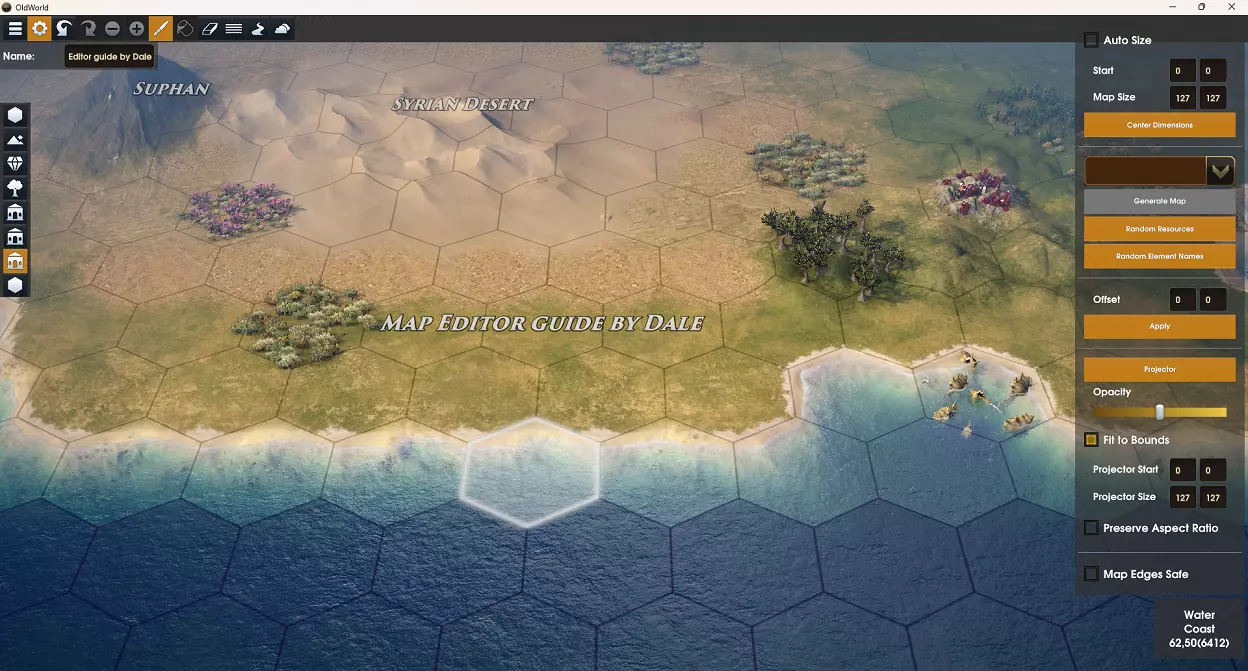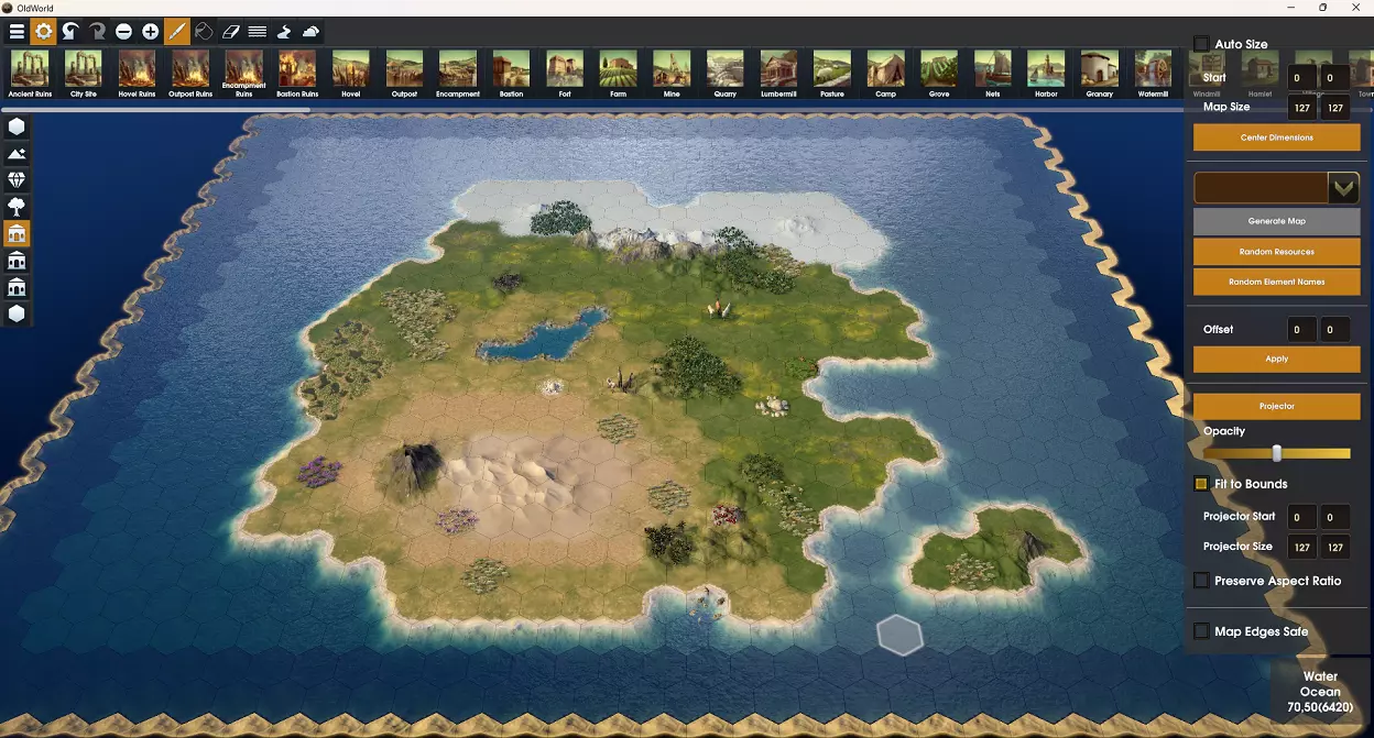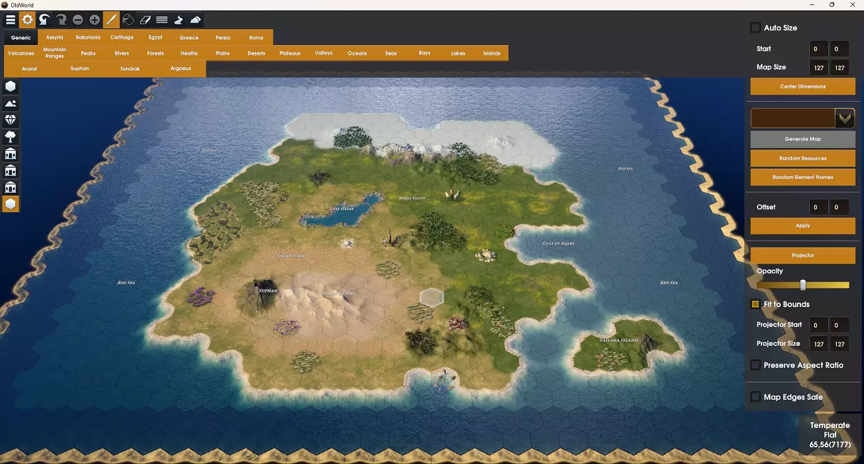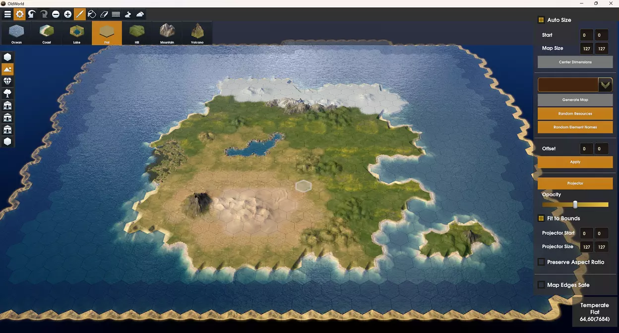 高度 地块的第二重要设置是其高度。默认情况下,当你绘制地形类型时,陆地地块的高度为平坦,水域地块的高度为海岸。对于水域类型的地块,你可以将它们定义为海洋、海岸或湖泊。陆地地块可以定义为平坦、丘陵、山脉或火山。 提示:不要忘记你可以更改光标大小,以帮助快速绘制更大的区域。
