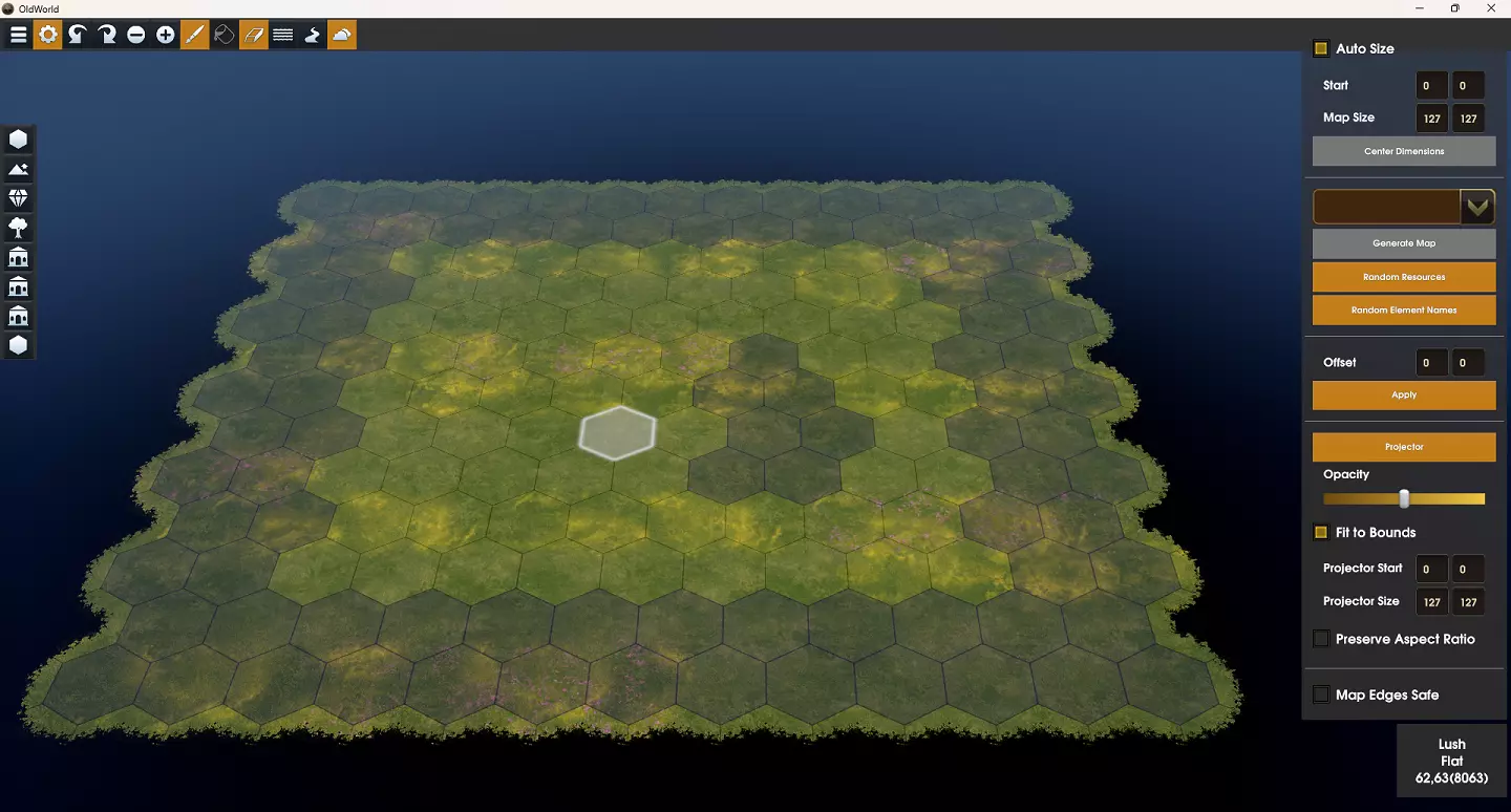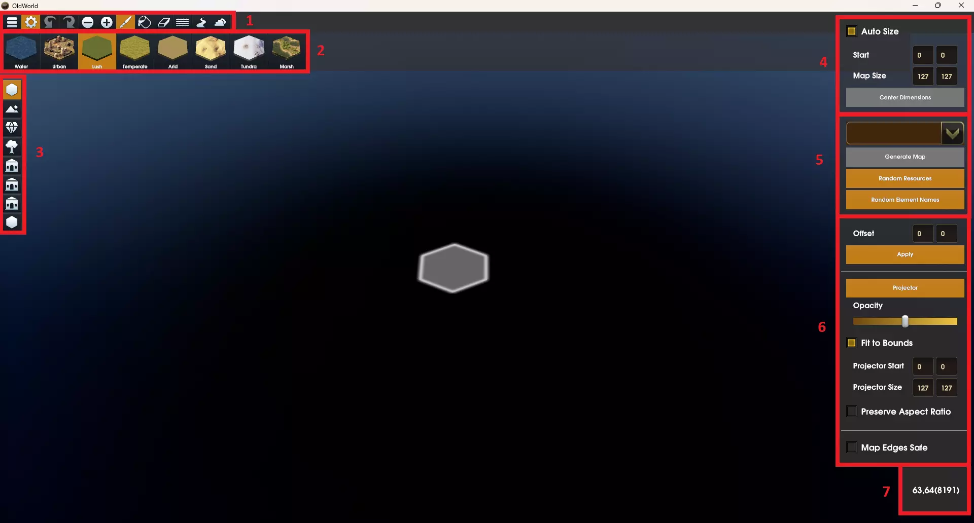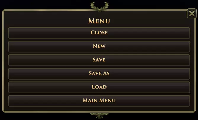 1. 菜单栏 菜单栏可用于访问地图编辑器内的常规功能和工具。 2. 地格面板 根据地格面板中激活的工具,会显示可绘制在特定地格上的各种元素。默认视图显示的是主地格面板,可用于指定不同的地形类型。 3. 工具 工具提供各种地格面板,以便创建地图。不同的面板包括地形类型、高度、资源、植被、改良设施、城市选址和地标。 4. 地图尺寸助手 地图尺寸助手用于定义地图的原点以及地图的宽度和高度值。 5. 地图生成器助手 有三个地图生成器助手可协助创建地图。地图编辑器辅助工具 地图编辑器辅助工具提供多种方式,让地图制作过程更加简便。 7. 地格信息 此处会显示光标所在地格的各类信息。最基本的信息包括地格的“X:Y(地格ID)”。 菜单栏项目 菜单按钮 菜单按钮用于打开地图编辑器菜单。你可以通过该菜单新建空白地图、保存地图、加载地图,或返回《旧世界》主菜单。