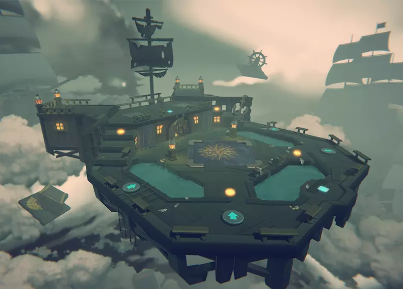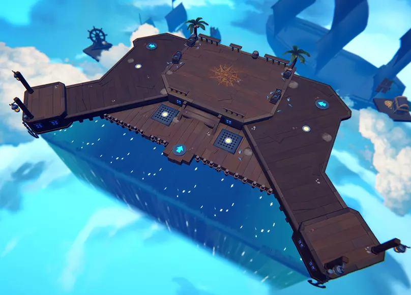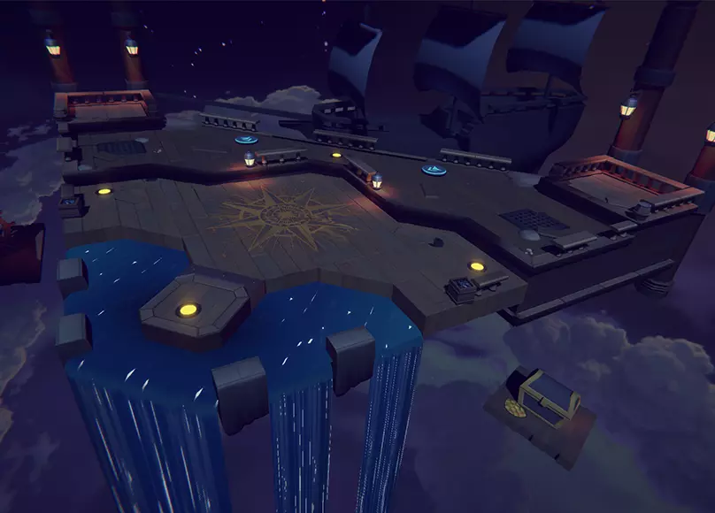 无照太空船坞 - 平流层是我们为统治模式推出的首张非海盗船场景地图。该地图顶部设有一个据点,每30秒会上下移动一次,移动前有2秒准备时间。地图顶部靠近起点处设有2个跳跃平台,以及3个道具圆盘。 位于顶部(靠近统治据点处)的道具圆盘固定刷新生命药水,而底部(靠近玩家出生点处)的2个道具圆盘则会随机刷新技能盒或炸弹。