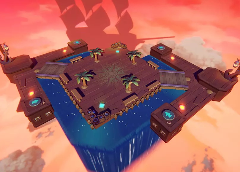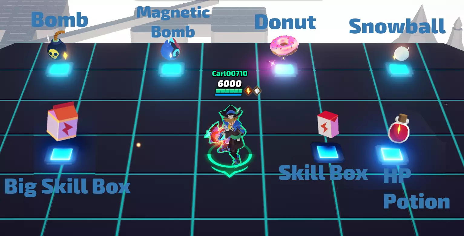 海盗船 - 雨是我们最新发布的海盗船地图。该地图的下方区域放置了4个跳跃板,6个道具磁盘均匀分布。 顶部和底部的磁盘各有一个固定道具:顶部的是大型技能箱,底部的是磁性炸弹,这两个都是非常强大的道具,能迅速改变游戏局势。其余4个磁盘可能包含炸弹、生命药水或技能箱。