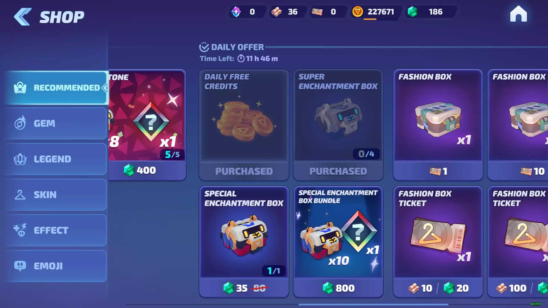 推荐页面是进入商店后首先看到的内容,相当于主页面。该部分主要分为两个板块:特惠和每日。特惠是限时的特别优惠,通常具有额外价值或折扣;每日是每天刷新的优惠,其中亮点包括免费 credits、超级宝箱和附魔商店。附魔商店还有每日刷新一次的特殊功能(拥有高级通行证可刷新两次),并且是游戏中唯一使用附魔核心的地方(有关详情请参见货币部分)。