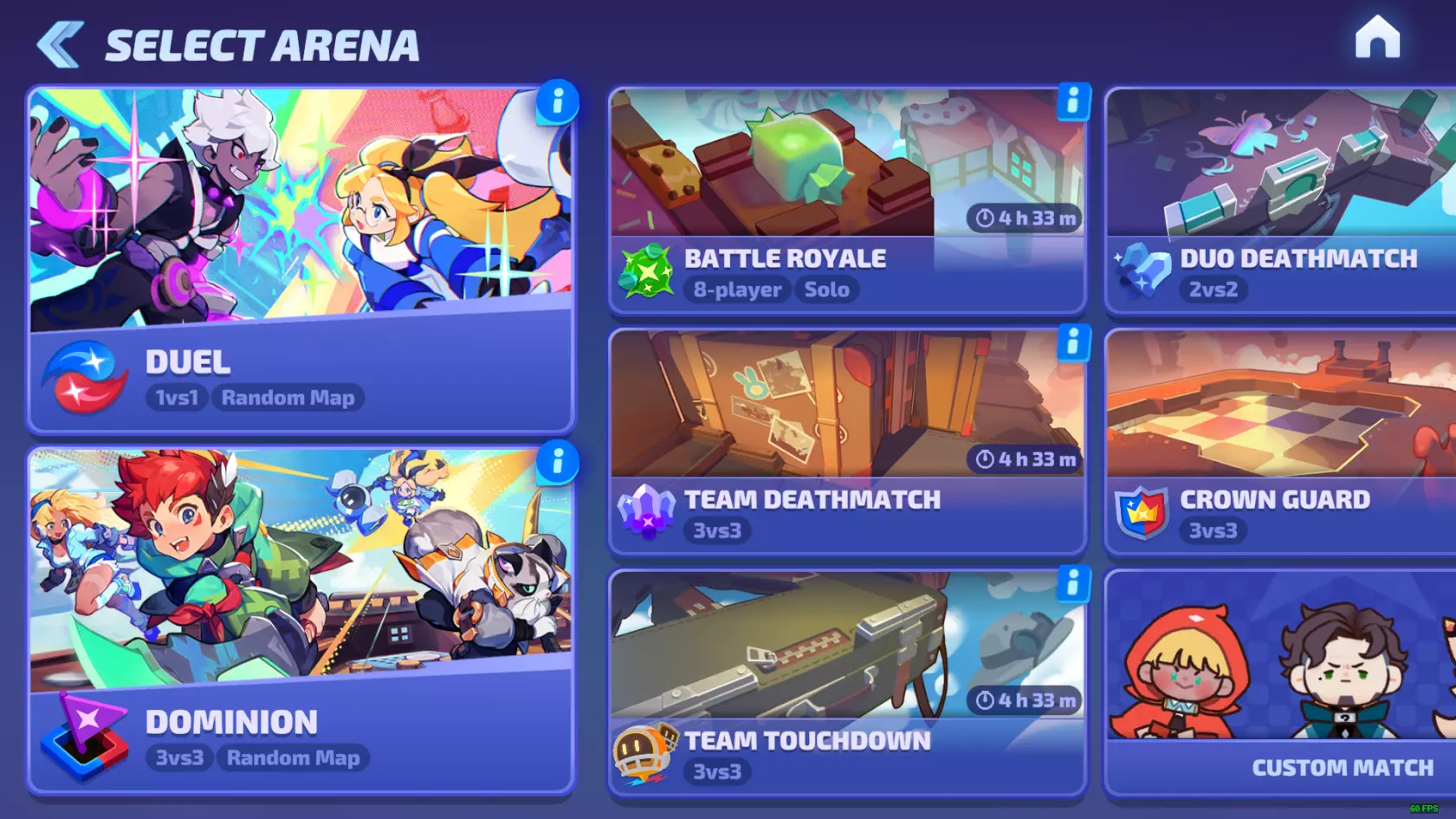 赞助商奖励会随时间累积,每小时可获得5 credits和20经验值,需手动领取(达到12小时后停止产出奖励)。 你还可以获得赞助支持,这是一种跳过时间要求的方式;赞助支持基本上可以立即累积特定时间阈值的奖励,奖励甚至可以超过100%(仍需手动领取)。 皇家赞助是赞助商的升级项,可使所有奖励翻倍,并将最长时间从12小时增加到24小时。其价格约为12美元。 6:竞技场 竞技场是《传奇大乱斗》中各种游戏模式的总称。游戏中有多种游戏模式和地图可供游玩,但这部分内容将在本指南的另一章节中介绍,因为本章我们将讨论地图在用户界面中的显示方式。