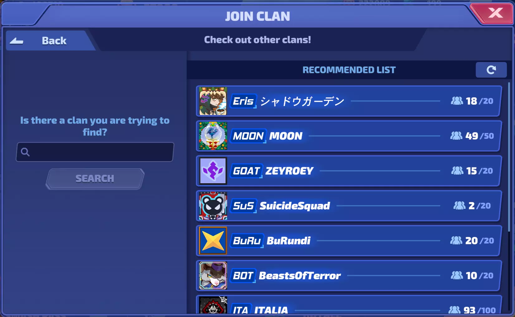 氏族菜单会显示一堆推荐你加入的氏族,同时还设有搜索栏。如果你想创建氏族,只需花费200宝石,为其命名、设置标签和描述即可。 目前加入氏族除了能在各种菜单中显示氏族标签外,暂无其他实际用途。以下是在大厅中看到的示例。