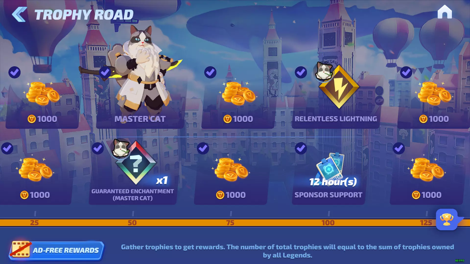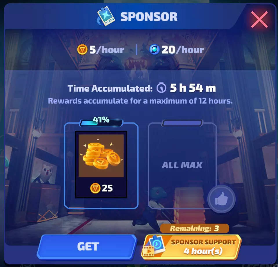 特效页面可查看所有未拥有的特效,并决定是否用宝石购买。你可以按3种特效类型进行筛选,也可以按发布日期/最高稀有度筛选。 5:赞助系统 赞助系统在奖杯之路达到175杯时解锁,它是一种让传奇被动获取经验值的方式,同时还能获得少量 credits(游戏币)。操作方法很简单,只需点击经验值槽并选择你想要升级的传奇(放心,你仍然可以使用放置在那里的传奇!)