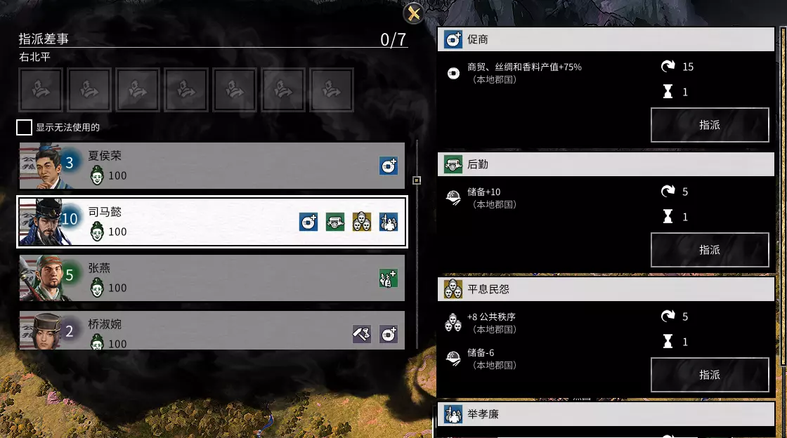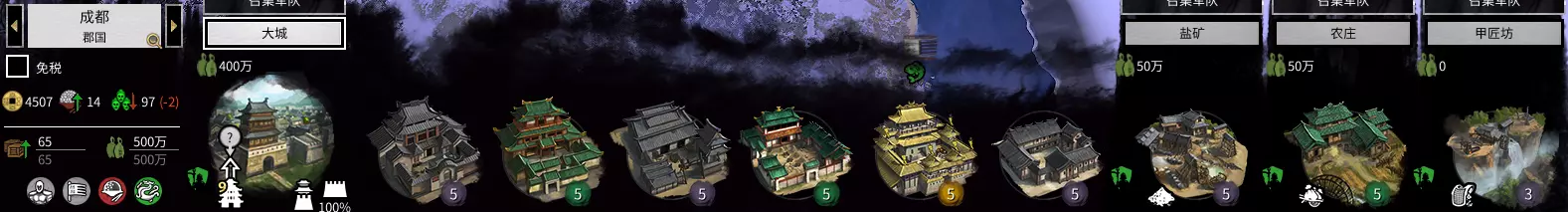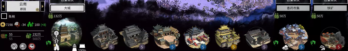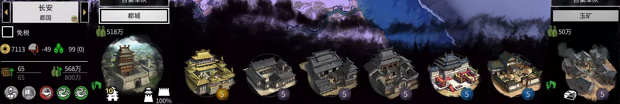 农业商业省。 可以把我的特殊建筑,换成工业类第三个(加工商业产值的)。为什么这个省还要建工业呢?因为工业建筑可以减腐败。所以是,二农二工二商。 引用自 Isshin Ashina:大佬那个人口一直减是什么意思啊不管正负增长都减,然后那个公共秩序也一直减,造那些加秩序的也没用是怎么回事啊,怎么处理啊 我没明白什么叫人口一直减。影响人口的因素很多,季节、建筑、改革、太守等等。 若想增加人口,除了委派太守外,还有两点很关键。 建造增加人口的建筑,拆掉减少人口的建筑。 公共秩序提升至-25以上。公共秩序过低,会掉人口。公共秩序减少的原因如下:当权者(马腾-4)、郡国内存在敌对势力以及人口过剩。 最关键的因素是人口过多!主城等级越高,人口上限就越高。随着人口持续增长,公共秩序会不断下降,最高可达到-30! 刚占领的城市,经过几个回合后,公共秩序惩罚和产值惩罚就会消失。具体内容将在详解篇中说明,这里先给出建议: 为派系领袖、储君、丞相配备相应物品,可增加全派系公共秩序。 改革中共有公共秩序加成,将其全部点出后,全派系公共秩序可+10。 如果以上两项措施加上建筑仍无法稳定公共秩序,就只能暂时减税或免税,但这是下策。引用自Ranor:攻下城池之后一般选哪一个呀?AI老是把城运营得又缺粮又没有公共秩序,很想推倒重建。而且后期一回合好长啊,好多钱一个个城升级累死了,董卓的毁灭暂且不提。 占领城池后有三个选项:占领、劫掠占领、劫掠撤退。其实不用纠结的,一般情况下: 前期的时候不要考虑,打下来的都要做根据地的,直接占领。 高难度情况下,重要的是不要四处引战、不要把战线拉得太长。所以优先统一行省,其他的地盘不要太贪,不好占的地方抢了撤就好了。因为这些地盘尤其是小资源点你占了公共秩序也压不住。在游戏中后期,当敌方城市等级较高时,如果想要占领该城市且粮食充足,就不要进行劫掠。因为劫掠导致城市等级下降一级后,你需要花费大量资金才能将其重新升级。例如:当粮食不太充足时,面对一座6级城市,可以选择掠夺并占领,这样既能减少粮食消耗,也不会减少城市的建设格子。刚占领的城市公共秩序较低,这并非AI发展的问题,而是所谓的“行省动荡”。这也是我特意强调“行省统一”的一个原因。 引用自玩家提问:我想请教一下,物品上的属性加成有【辖下】字样,是否只有当角色担任太守时才有效?人物自身的属性和天赋是否也只有在担任太守时才会计算?在某郡执行任务的人物,这些加成会在该郡生效吗?另外,如果主公不带兵,也不能像太守那样处理内政或执行任务,那主公能做什么呢?那么属性【辖下】怎么计算?还是只能搭配【全势力】?我看到AI电脑的主公不一定在地图上带兵,那么主公还可以做什么?加成又该怎么计算? 当然,军团的加成应该很容易理解。我不理解“在某郡做任务”的说法,不过想必这是不会计算加成的。