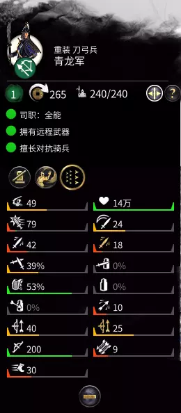 CA这波做得良心 《全面战争:三国》懒人攻略其一:战法 LAB——高级兵种测试 通过多次测试,比较乾天坤地、龙军、各派系特有兵种间的强弱。 多次测试胜负结果相同,伤亡数据则选取自最后一次测试结果。 步兵 青龙军的测试比较极限,敌人站在青龙军射程边缘,青龙军可以充分射击。 青龙军不摆特殊阵型(没用) 败者剩余数量显示为“/”的,则表示与获胜者相差不大 对抗 获胜方 胜方剩余 败方剩余 青龙——乾天 青龙 54人,2.9W血 全军覆没 青龙——白龙 青龙 62人,36万血 / 乾天——白龙 乾天 39人,2.0万血 全军覆没 黄龙——白龙 白龙 84人,4.5万血 22人,5.0千血 黄龙——乾天 黄龙 29人,8.6千血 全军覆没 黄龙——青龙 黄龙 70人,3.8万血 31人,4.8千血 看完后大家有什么感觉?就像互相克制一样不是吗... 那么说,白龙军是不是有点鸡肋啊?不能这样说的。 白龙与青龙顶着黑龙的箭雨前冲 白龙 青龙 剩余111人,6.6万血 28人,1.6万血,白旗溃败 实验证明,白龙军打轻甲部队极强。但对付重甲单位(乾天),则显得力不从心。弓箭手这里先只测试两个:黑龙与坤地。 坤地射程更近,故测试分别为:同时射击/黑龙先射 对抗条件 获胜方 情况概述 黑龙先射击 黑龙军 坤地冲到射击距离后,已半血以下,随后白旗 同时射击 坤地 坤地射击四轮,黑龙军残血白旗,坤地伤亡四分之一 骑兵选取玉龙、西凉重骑、虎豹重骑为测试目标。 只有一次冲锋,随后是近战。测试中,败者基本全军覆没。 对抗 获胜方 胜方剩余 玉龙——虎豹 玉龙 16人,2.6W血 玉龙——西凉 西凉——虎豹 西凉 25人,3.9W血 Q&A 引用自 人工智障 琪亚娜◑▂◐:大佬,白龙还能抗骑兵,是不是抗线全白龙也行,青龙碰见刀兵会不会暴毙的快?木将也可以带全白龙顶线吗,望大佬解答。 首先你要知道,木将是带不了白龙军的~ 白龙是可以抗骑兵,杀步兵,挡远程。你用全白龙不是不行,但还是那个最大的问题:【轻甲】。尤其是遇到人很多或者大部分是中甲轻甲的敌人,损伤绝对不小。所以我才说白龙适合侧翼包抄。 青龙不会暴毙的啊。即使对上白龙/乾天也不会一触即溃,更别说不是顶级兵种的了。53%的护甲,39%的近战格挡,14万的血量。让他做抗线兵是没有问题的,唯一的缺点就是无远程格挡。对面弩兵多的情况下,需要骑兵快速包抄(乾天同理) 引用自muliqidubin:内政方面有些城资源是混合型的,很难取舍。混合型的取舍问题。我会在详细攻略里写的,但既然你问起来了,我就先简要说一下。给你几张我的城市截图(使用的是公孙瓒,故有特殊建筑)。