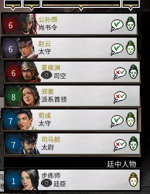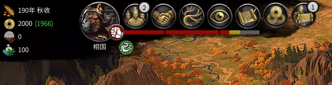 左侧四排内容说明: 第一排为时间,显示年份与季度(游戏中一年分为五个季度,分别是春、夏、秋、冬、秋收)。 第二排为府库,其后为下回合的财政变化数值。 第三排为粮食,显示粮食产出减去消耗的结果。若结果为正数,则表示有粮食余额,可补充郡国的粮食储备;若结果为0,无需担忧,不会有任何负面效果;若粮食结果为负数,军队将无法补充补给并开始减员,郡国也会开始消耗储备粮。第四排是贸易影响力,鼠标悬浮可看到己方派系已有的特殊资源(如茶叶)。 右侧部分: 人物头像是派系概览,可查看声望阶段、派系特性等信息。 第一个是派系界面,可任命官职、进行婚姻或收养义子操作,还能查看人物关系网。 第二个是外交界面,可签订各类条约及进行外交交易,内有快速协议功能。 第三个是科技树(后续会展示),每五回合可选择一项改革(黄巾军有所不同),这非常重要。 第四个是细作界面,前提是已派遣细作,细作可执行开城门甚至刺杀派系领袖等任务。 第五个是记录界面,记录了派系发展过程中的各类大事件。 第六个是府库界面,可查看具体收支情况,并在此调整税率。 第七个是幕府会议界面,可在此领取任务。红色长条:每个派系各不相同,拥有各自的特殊资源,例如董卓的特殊资源为【威慑】。 绿圈或红圈:代表派系的增益效果或减益效果,显示在左侧。