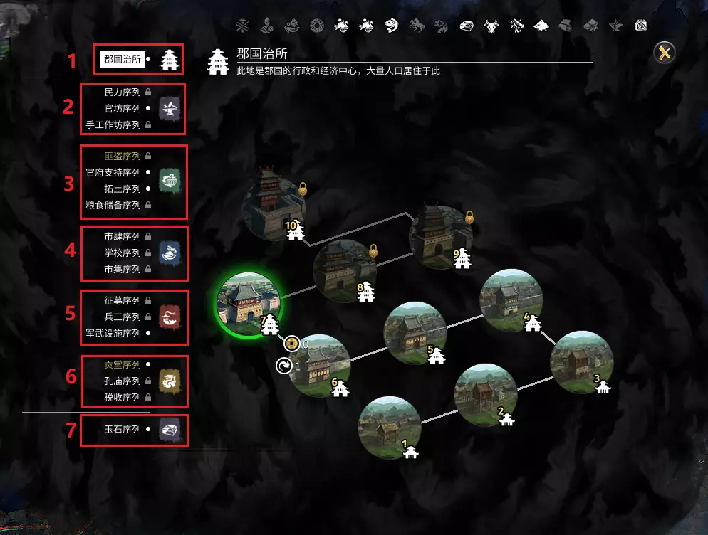 郡国建筑可理解为主城,许多附属建筑需要主城达到一定等级才能建造。 金系:工业类基础产值或加成,包含减少腐败的建筑。 木系:增加粮食产量,提供农业基础产值或加成。 水系:商业产值或加成,提升商业影响力;学校:增加将领经验获取。 火系:军事建筑。土系建筑:增加公共秩序等 资源点建筑:小城的建筑,根据资源不同而有所差异,升级后会增加驻军 一个郡国建造何种建筑取决于其拥有的资源点: - 铁矿、铜矿等资源可增加工业产值,主城适合建造工业类建筑 - 商港可增加商业产值,主城适合建造商业类建筑 - 农田、畜牧场和渔港可增加农业产值和粮食产量,主城自然以木系建筑为主 改革即科技树,此处先简要介绍常规科技树,黄巾军的道德经将在详解篇中说明。 科技树需先研究低级科技,才能解锁下一阶段。各类型科技对应颜色如下: - 农业=绿色 - 商业=蓝色 - 工业=紫色 - 军事=红色 - 内政=黄色