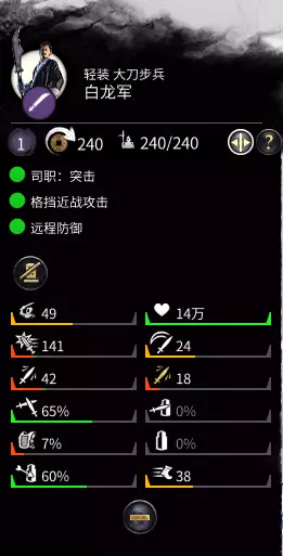 工业 白龙军,轻装,大刀兵。近战杀伤很强,具备玄幻远程格挡能力。适合从侧翼对付少量敌人,迅速突破并进行包抄。个人非常喜欢使用该兵种,比乾天军使用频率更高。虽然白龙军同样无盾,但自带斩箭术,简直就是三国版的赫斯剑圣,可格挡60%的箭矢。其缺点是护甲过低,不建议用于抗线。该兵种对付轻装部队极为高效,应部署在侧翼,突破敌人防线后实施包抄。