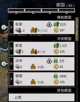 军队相关信息,包括各军队的维持费用、军队人数、补给量等(稍后详细说明) 郡国界面信息,包括各郡的粮食产量或消耗量、公共秩序、人口、收入,以及是否有可建造的建筑