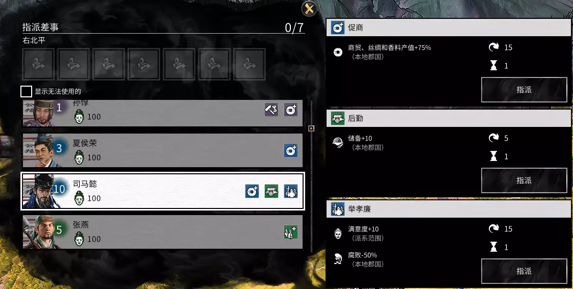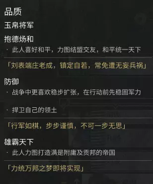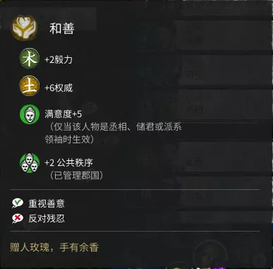 如上二图所示,顾名思义: 描述中有【已管理郡国】,则为作太守时的额外加成——效果仅限此人作为太守管辖的郡县 描述中有【当人物是领袖、储君和丞相】,则仅装备在此三人身上有效——效果是派系范围 描述中有【解锁差事】,则增加了该人物的差事,如下图