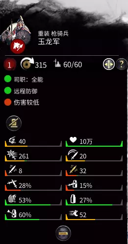 军事:玉龙军,重装骑兵。该兵种血厚防高且配备枪盾,无论是正面冲击敌方骑兵、突击弓箭手,还是绕后进行背冲,表现都十分出色。 强度评级:中/高。解锁该兵种需要点出大量红色军事改革线,而在前中期通常不会优先选择军事类改革。但玉龙军是能够与曹操的虎豹骑、马腾的羌族骑兵、董卓的西凉铁骑正面抗衡的强力兵种!在对抗骑兵较弱的阵营时,建议务必解锁该兵种。