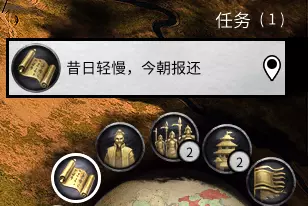 最大的圈是小地图,其实完全没用。几个小圈是任务列表,系统任务和幕府任务都在这里。