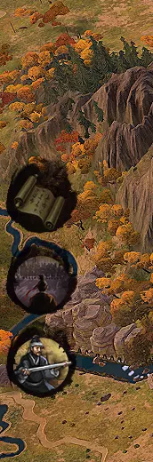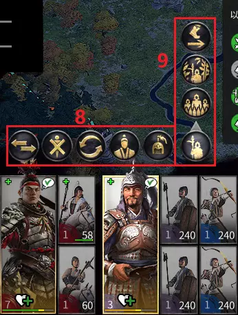 加减号:放大缩小小地图 上面一排:慢速、常速、暂停、二倍速、三倍速 左下角:切换至战略地图(战场俯瞰图) 进入战场后的部队选项: 步兵选项