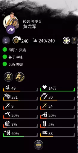 内政:黄龙军,盾斧兵。该兵种轻装,但生命值和防御都不错,抗线能力强力。 冲锋属性:较低。比起一般的抗线兵种,多了冲锋属性,冲锋加成也不低,但没什么实际作用。因为该兵种造价太高,实在没有必要招募。更关键的是,想要解锁该兵种,需要进行很多改革,其中很多还是前期暂时不会点的,没必要为了它去改变科技研发顺序。