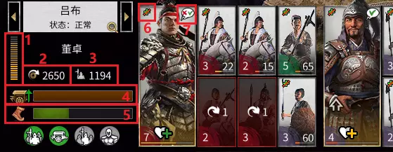 部队军力:格数越多则军力越强;下部亮黄色为目前军力,上部暗黄色为补员满员后军力 军队每回合维持费用 军队人数 军队补给量:在敌方领土时,每回合减少。减为0部队开始损耗 军队剩余移动力 补员状态:当前为无法补员