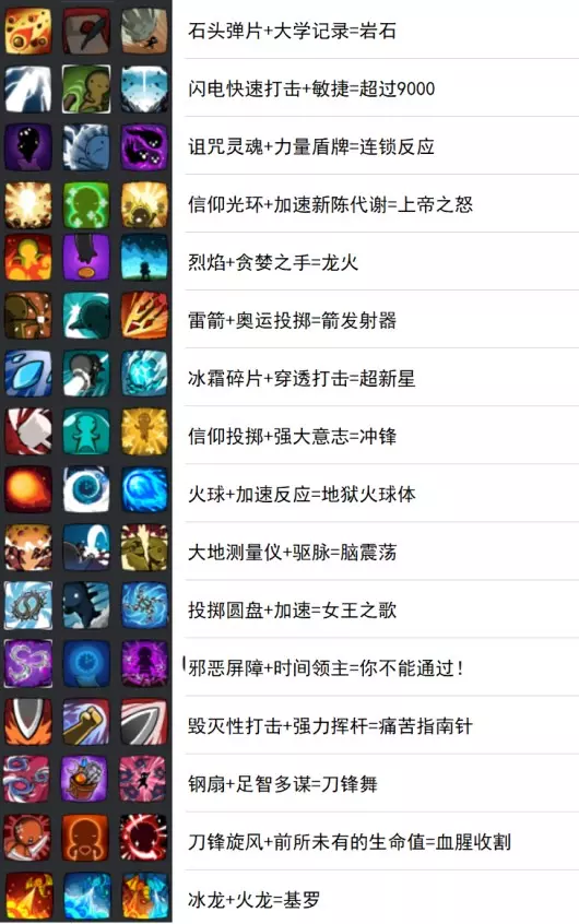 图片从DC的Liudows分享而来,只是少了生命之线/命运之线和各种召唤技能。基本上除非地图/角色限制,不然这些技能都是照着点最优解。 T0必选的: 火球+加速反应(主动输出好,被动更强) 复活(T0中的T0) 贪婪之手(增加吸经验的效率,看自己跑图需求决定要不要点高) T1强势的技能: 石弹+大学纪录(主动输出好,被动增加升级的效率) 闪电打击+敏捷(看需求,角色有需要用到才会点主动+被动) 力量盾牌(后期扛远距伤害用) 雷箭+奥运投掷(风系单体输出,升级后是加特林,被动增加技能速度能打到画面外的箱子) 穿透打击(初期没点攻击系的穿透可以先用这个顶,像是艾琳火球流) 加速(跑图专用)生命之线+命运之线(合成技能,全屏输出)。T2弱势技能(但有时还是需要)。XX化身(通常是没得选才选,能增加输出就赚)。冰霜碎片(输出往后方发射)。投掷圆盘(输出从角色飞出后又反向)。毁灭性打击+强力挥杆(大部分都是物理角色需求,被动通用但比单一化身弱)。钢扇+足智多谋(同上条)。刀锋旋风+生命值(同上条,但被动后期可能单独有用)。各种召唤技能(除非角色是召唤系的,不然都是没得选才选)。T3垃圾技能(我只有解任务才用过)。信仰光环+新陈代谢(角色周围伤害光环,但就是范围仅限周围)。被动回血效果不佳,建议选择食物恢复。 烈焰:通常是在没有其他选择时才会选用,效果为对角色周围造成伤害。 信仰投掷+强大意志:未升级前,技能是向角色头顶投掷锤子并向角色下方飞行,输出难度较大。 大地测量仪+驱脉:除非角色有特定需求,否则输出能力较弱,效果为对角色周围造成伤害,被动击退效果实用性不高。 邪恶屏障+时间领主:除非角色有特定需求,否则输出能力较弱,效果为对角色周围造成伤害,被动持续时间效果实用性不高。 冰龙+火龙:合成技能,效果为对角色周围造成伤害,且会导致帧率下降。 角色装备推荐 【装备点开后可查看攻击、血量、能力及套装效果说明。】 套装效果需要集齐五件装备,不分装备颜色品质。攻击/血量是最直观的能力,通常都选择属性最高的那件装备(除非有高阶能力的装备能带来很大帮助)。 初期有高能力的装备就用,没必要凑整套套装! 前期优先升级手套和戒指,这两个部位增加攻击;头盔、衣服、鞋子增加血量,有材料了再升级。 就算是蓝色品质的法师/游侠/野蛮人/征服者装备,也比红色品质的民兵装备好! 如果有活动装备,也可以对比其能力是否比当前装备更有帮助。 套装效果只有在整套都是红色品质时才需要考虑挑选,因为部分套装部件的效果没什么用。中期开始可以用商店慢慢凑装备(不用急着换,根据自身能力做取舍) 头盔:红色品质中,浪人头盔(冷却时间与+1复活)优于游侠头盔(冷却时间、输出)和战士头盔(+1复活、防御),后两者效果相当 手套:红色品质中,游侠手套(攻击)最佳;浪人手套主要难凑,且击退效果用处不大,与法师手套(范围效果用处不大)、野蛮人手套(生存)、战士手套(生存)效果相当 衣服:红色品质中,法师衣服(回避)和游侠衣服(减伤)效果相当且优于浪人衣服(减少1投射物,但有回避+减伤) 戒指:红色品质中,野蛮人戒指(主要是被打回血,前期怪物伤害低且回血概率高)最佳,其次是法师戒指(仅增加跑速,无回血),其他戒指(浪人、游侠的红色品质能力都较差) 鞋子:红色品质中,浪人鞋子(跑速+吸经验范围)最佳,其次是法师鞋子(跑速),然后是战士鞋子(吸经验范围),游侠鞋子(投射物速度)和野蛮人鞋子(较差)效果相当 星堡装备(商店用星币购买的装备)大部分都用不起,养到红色品质不知道该怎么凑齐