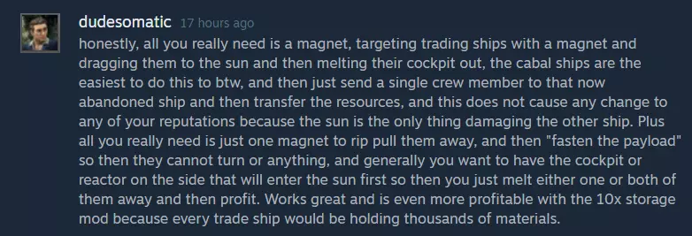 好了,现在你应该已经拥有自己的飞船了,希望它看起来和右边的那个有点像。接下来让我们了解如何操作这些海盗船。 海盗船的操作方法: 首先,我建议你选择一个不进行劫掠的势力(这样你就会有地方出售货物、招募更多船员以及进行其他活动)。确定了不劫掠的势力后,你就需要寻找目标了。找目标很简单,只需找到那些武器比你少,且拥有大量【目标部件】的飞船(详见下一部分)。拥有大量【目标部件】的飞船通常体型较大,这意味着你可以从中获取大量钢材,用于扩建货舱。你可能会喜欢某些舰船并想要捕获它们,但在转移船员之前,请先考虑其外形轮廓(这是因为将一艘非常厚实的舰船改造成纤细的形态难度很大,且需要花费大量时间)。 可掠夺物品 现在你已经捕获了一艘舰船,想要从中掠夺些东西,接下来我会告诉你该掠夺什么。这部分内容我需要分成多个子部分来介绍,具体如下: 推进器:对于推进器,我们实际上只需要获取大型、巨型、助推器以及引擎室,因为其他类型的推进器无法产出【超螺旋线圈】,而这种物品价值不菲。 控制室:每艘舰船都配备有控制室,我强烈建议将其拆解。不过,控制室在攻击舰船时是主要目标,所以有时可能会被摧毁而无法获取。 反应堆:我对反应堆的看法与控制室类似,只是它们在大型舰船上更为常见。武器:大多数武器都会对你造成严重伤害,毕竟它们能带来不少收益。不过,如果你足够聪明并制作出针对离子束的装甲(见下文),离子束武器可能会非常值钱。