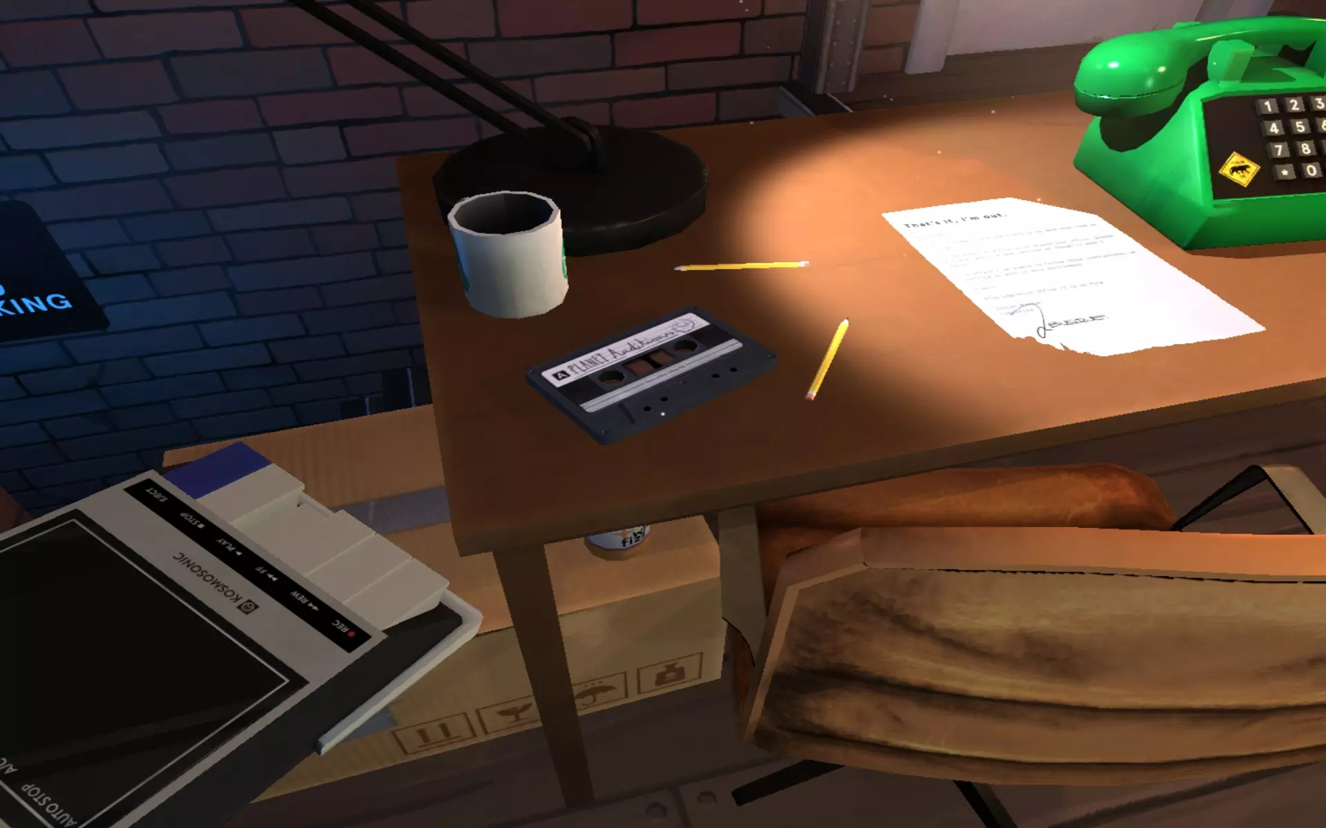 Tape 2 is labelled "PLANET Auditions". It plays as follows: Auditioner: "Alright, state your name." Terry: "My name is.. my name is Terry." Auditioner: "Alright, Terry. So, you're playing the role of a giant cucumber, you're being chased by lawn— garden people. So just go ahead, let me hear what you got." Terry: "Okay, here we go. Hey, I'm a giant cucumber, check me out! I'm a giant cucumber!" Auditioner: "Alright, that's pretty good. Can you do that.. can you be a little more, a little scared-er? A little scared-er, please." Terry: "Okay. Oh, man, I'm a giant cucumber, I'm so scared! Oh, geez! Check me out, I'm a giant cucumber!" Auditioner: "Alright, that's pretty good. Next! Alright, um, you're playing the part of.. you're recording for the part of, uh, a giant garden person who's chasing a huge cucumber. State your name and go ahead and give me a.. go ahead and give me an audition." Willy: "Uh, my name's.. my name's Willy. And, here we go. I'm a— I'm a giant garden person. I'm chasing a cucumber, come— come on back and get me. Come and— getcha. Er, I'm coming to getcha. I'm a giant lawn— er, garden character. my name's Wi— my name's Willy." Auditioner: "Alright, that's pretty good. Not bad. We'll, we'll let.. we'll, uh, we'll let you know. Next! Alright, um, state your name." Little Tommy: "Uh, my name's Little Tommy." Auditioner: "Alright, Little Tommy. You're gonna be auditioning for the part of the giant planet. So you're gonna be a whole planet that's in outer space, and you're gonna be getting chased by a whole bunch of pickles, cucumbers, all kinds of stuff like that, that are real big. So, go ahead. Let's hear it." Little Tommy: "Okay, um... oh no, I'm a giant planet! Oh, geez! Check me out, look at me, I'm a whole planet, I'm getting chased by a bunch of cucumbers and pickles and all that stuff. Oh, no! My name's Little Tommy. I hope I, I hope I— I hope I get this part. I'm really hoping I could get— I really need this money." Auditioner: "Woah, that was an incredible audition, little guy. Alright, well, we'll be in touch. Jenny, you got all this recorded? Alright, put this in Michael's office! This is one of Peri— Per— Perrié's games! Yeah, Pierre! I'm getting sick of this shi—" Tape 3: PENCILS Concept 1 The third tape recording is on the table off to the side in the third room (Backstage).
