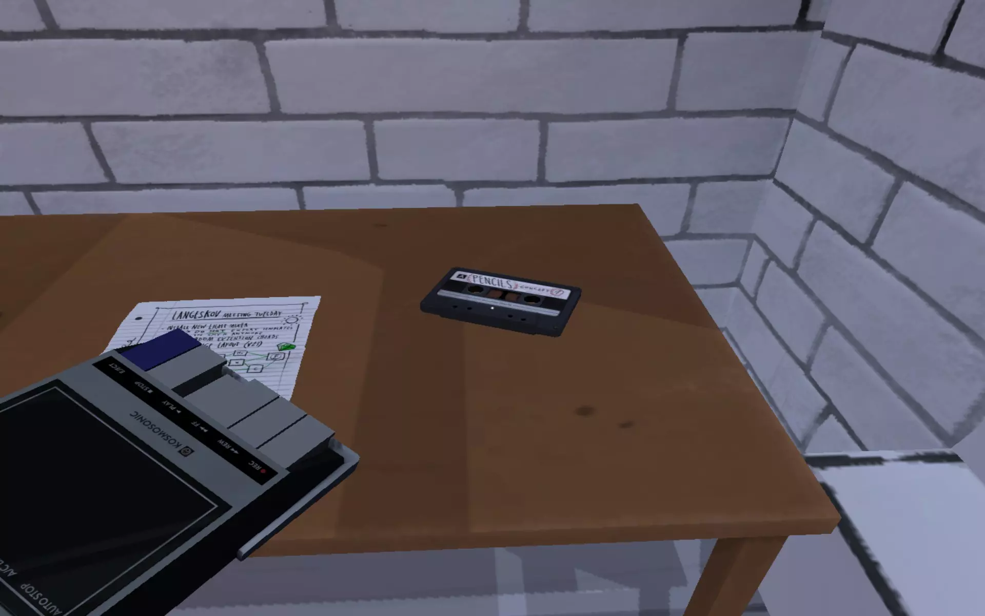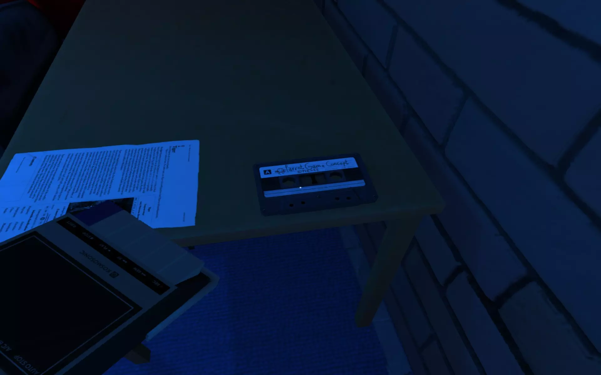 Tape 1: Parrot Game Concept Pick up the tape player with left click, and proceed to the first tape recording (located just to the right of the tape player).