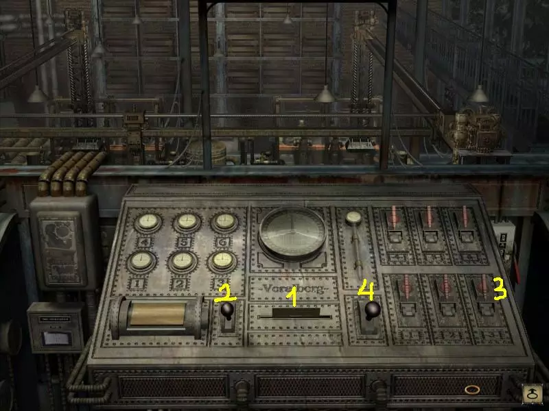Esc键或鼠标右键(PCM)- 打开物品栏,其中包含返回菜单、记录对话的笔记本、已收集的物品以及文档文件夹 左键(LKM)- 执行动作 光标变为羊角锤形状 - 使用物品,变为放大镜形状 - 查看物品或与角色对话,变为手形状 - 拾取物品 双击左键 - 奔跑 右键 - 翻页对话 不必与角色讨论所有话题在这款游戏中,你将扮演凯特·沃克。你是一名律师,来到瓦拉迪勒努小镇,目的是洽谈收购当地一家机械玩具工厂的事宜。 1. 初识瓦拉迪勒努 开场动画结束后,你会出现在一家旅馆里。从墙上的展示架取下关于福拉尔贝格工厂的宣传手册。走向前台,拿起小钥匙,启动机械人偶。跟着他回去并拉动拉杆。自动装置会降下,然后你就可以和他交谈了。原来他就是奥斯卡——火车司机。选择“生产”对话,奥斯卡会解释说他需要腿部零件,这些零件可以在传送带上用穿孔卡制作(穿孔卡会自动出现在你的物品栏中)。 前往机械室,经过入口门后向右走,到最角落里的那扇门。这里有一个启动传送带的机械装置。窗户右侧上方悬挂着一条链条,拉动链条后,链条旁的格子里会滑出一个机械松鼠。透过窗户,你会看到驱动传送带供水的大轮子开始运转。拉动地面上的杠杆,然后前往机械室。上到二楼,经过办公室向左走到一个小平台。这里有传送带的控制面板。将穿孔卡插入中央插槽,然后拉动中央插槽左侧的大型黑色拉杆。该拉杆用于选择木材种类。如果您阅读过关于福拉尔贝格工厂的宣传手册,应该会注意到最复杂的机器部件是用乌木制成的(手册上有一块木方的插图)。通过拉杆选择完全相同的颜色。接下来,按下右下角的开关(其他开关无法使用)以启动传送带。现在需要金属。 走出街道,前往喷泉。选择西北方向的小径,你会来到一个棚子处,棚子下的平台上放着一个巨大的金属坯料。支撑棚子的其中一根柱子上有一个拉杆。按下拉杆,工厂里会伸出一个机械夹爪,将坯料运进工厂内部。回到工厂(毛坯会出现在机械室里,位置在楼梯左侧,靠近工作室门)。旁边有一台装载机,点击它,它会把毛坯运到传送带。回到控制台,按下中央插槽右侧的大圆形操纵杆。点击桌上的大红按钮——小人会开始用锤子敲铃铛,听到声音后门房会出来。和他认识一下(需要打开物品栏并选择笔记本里的对话),试着拿行李箱,但凯特会拒绝。让门房把行李箱拿到房间去。你会目睹门房和角落里坐着的男孩之间发生了一场小争执,男孩会跑掉并散落一些齿轮。前往房间,床头柜上有一封等待你的信。阅读这封信——这是你上司发来的传真。门房告知,工厂的最后一任主人安娜·福拉尔贝格已于今日下葬,这意味着已无人可洽谈工厂收购事宜。致电上司并告知此消息。他会派遣凯特前往当地律师阿尔福尔特处,其地址将通过酒店传真发送过来。去找门房,打开笔记本并选择【任务】对话。凯特会向门房询问传真的事——门房会找到并交给她。向左走,捡起男孩掉落的四个齿轮(两个在桌子上,两个在地上)。离开旅馆,向左走几个屏幕。 你会看到一个门廊上方有招牌的房子。走上楼梯——这里没有门铃,而是装了一台自动售票机。打开“文件夹”标签页中的物品栏,选择2号传真,然后点击“拿取”,再用鼠标点击机器伸出的手。机器胸前有一个拉杆,点击该拉杆,机器会低下头。它的左手位置有第二个拉杆,点击该拉杆,机器会把传真举到眼前。律师会通过机器阅读传真并打开门。穿过接待室,进入左侧的门,坐在椅子上与律师交谈(选择“任务”对话)。律师会解释,安娜·福拉尔贝格有个弟弟汉斯,他是她的合法继承人,更详细的信息可以在工厂里找到。目前汉斯在西伯利亚的某个地方。拿走安娜的信,回到接待室。从入口门旁的挂钩上取下伸缩钥匙,然后出门到街上。从入口左侧的长椅上拿起报纸。向右走几个屏幕,在街道对面找到通往工厂的门。门上挂着两台自动装置。将伸缩钥匙插入上方自动装置的“手”中,用钥匙启动下方的自动装置,然后拉动两台自动装置之间门上的杠杆。门就会打开。 2. 为奥斯卡制作腿部 你会来到一个有喷泉和五条岔路的广场。选择通往西边的路,前往工厂。进入工厂后,从入口左侧的楼梯上到二楼,进入办公室。查看安娜·福拉尔贝格的桌子——桌上放着一封写给汉斯的未完成信件,信中包含后续行动计划。此外,桌上还有机车设计图和许多账单。从信中可知,安娜打算乘坐工厂的机车去汉斯那里,给他送去音叉。此外,汉斯还需要一个位于某个洞穴中的史前玩具。要让火车启动,还需要完成某个名为奥斯卡的装置。 向下走,从楼梯一直向左走(途中凯特会接到母亲的电话,母亲告诉她遇到了俄罗斯歌手弗兰克·马尔科维奇)。进入大厅深处(远景处)的门——那里是工作室。你会看到一个被挂在支架上的机器人。