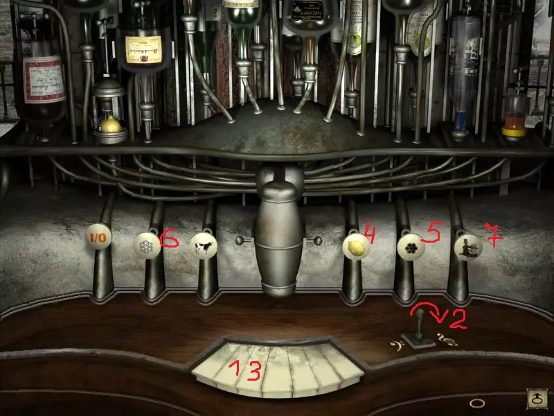 两位棋手旁边有一个小浴缸。走近浴缸,转动墙上的轮子来加热水。将一罐蜂蜜放入浴缸,凯特会自动取走融化的蜂蜜。前往吧台。 按下最下方一排最左侧的按钮启动设备,然后将柠檬、伏特加酒瓶和蜂蜜放入上方一排的空槽中(物品只能放入指定位置)。请注意,酒吧里有一些按键和一个可在低音键与高音键之间切换的操纵杆。拿起摇酒器正上方上层架子里卷成管状的饮品单并阅读:若按下低音键上的“Re”,自动售货机就会供应伏特加;若按下高音键上的“Mi”,则会供应蓝橙酒。目前自动售货机处于低音键模式。此外,下方一排有“柠檬”键——用于榨柠檬汁,“蜂巢”键——代表蜂蜜,“雪花”键——代表冰块,“调酒师”键——用于混合。 操作步骤如下:按下“Re”键(左数第二个键)——这是伏特加;切换到小提琴键,按下“Mi”键(左数第三个键)——这是蓝橙酒。按下柠檬、蜂巢、雪花和调酒师键——鸡尾酒就完成了。