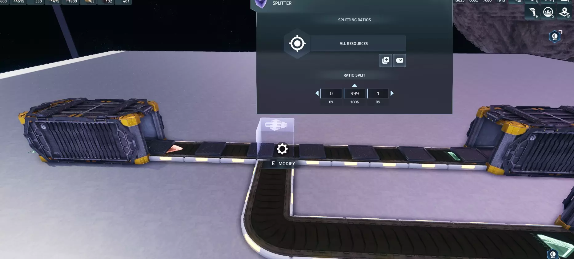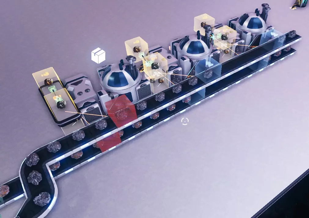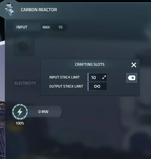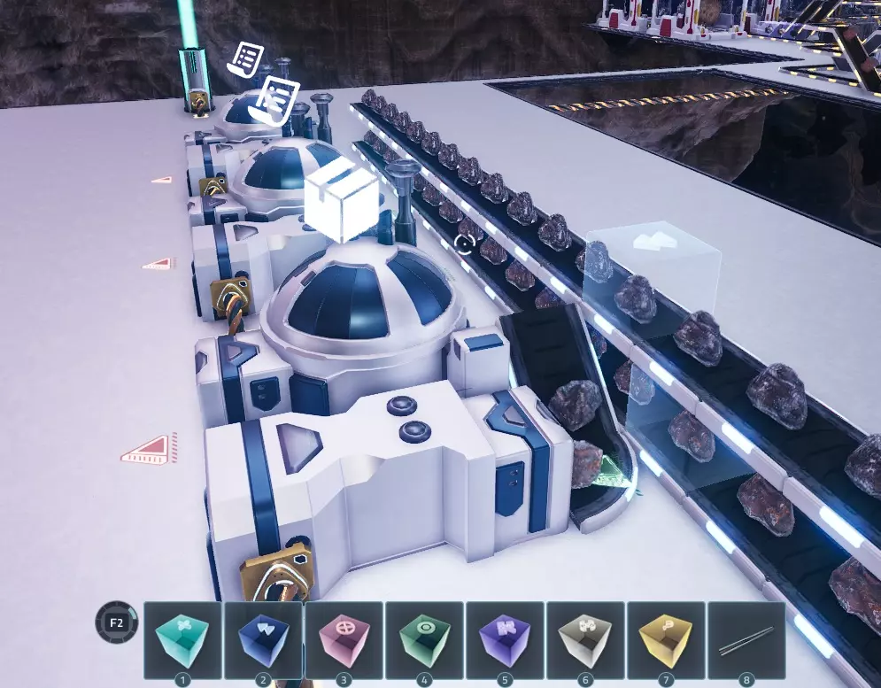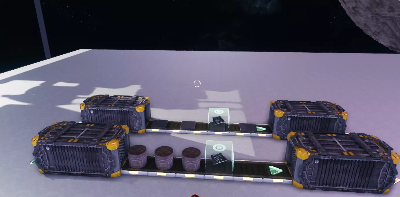 为机器供料 你想要让机器开始工作。 如果你只是想用一种资源为一台机器供料,只需将传送带连接到输入端即可,但要是想为多台机器提供多种输入资源该怎么办呢? 本部分将教你如何实现这一点。 1. 多台机器共用一个输入 为多台机器提供单一输入资源相当简单。 当你对着机器按下E键时,可以点击齿轮图标来配置输入和输出物品的最大数量。将其调低至你想要的数值,一旦机器装满,就不会再接收物品了。
