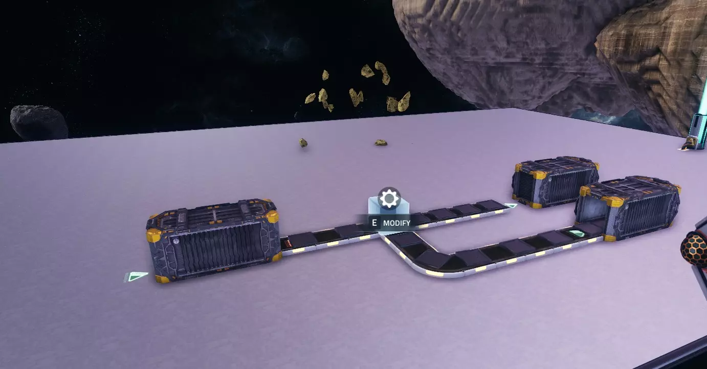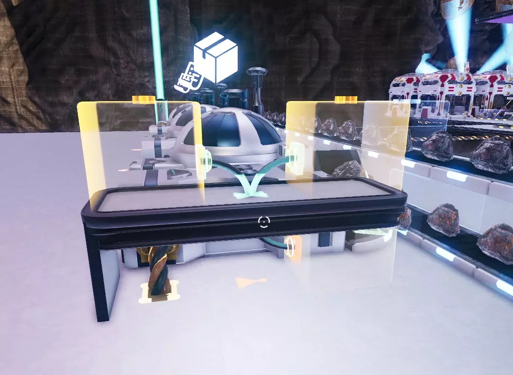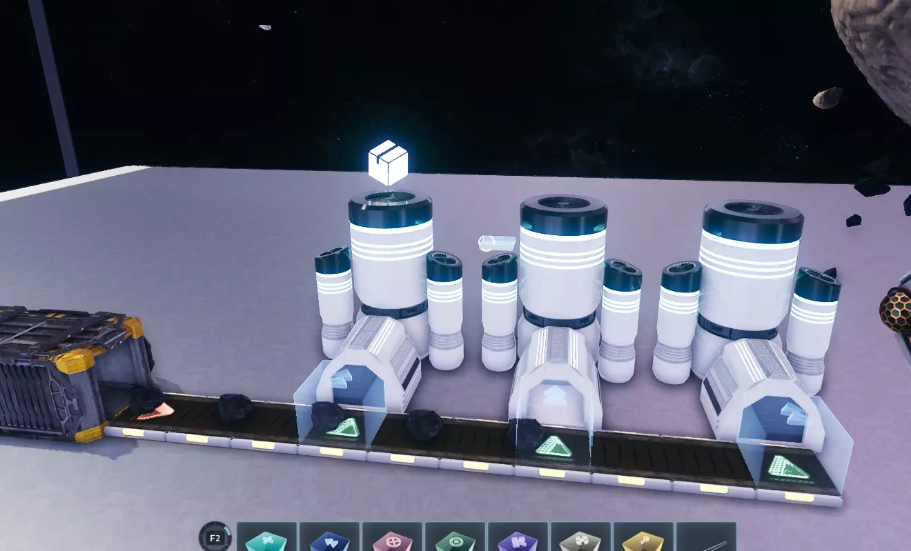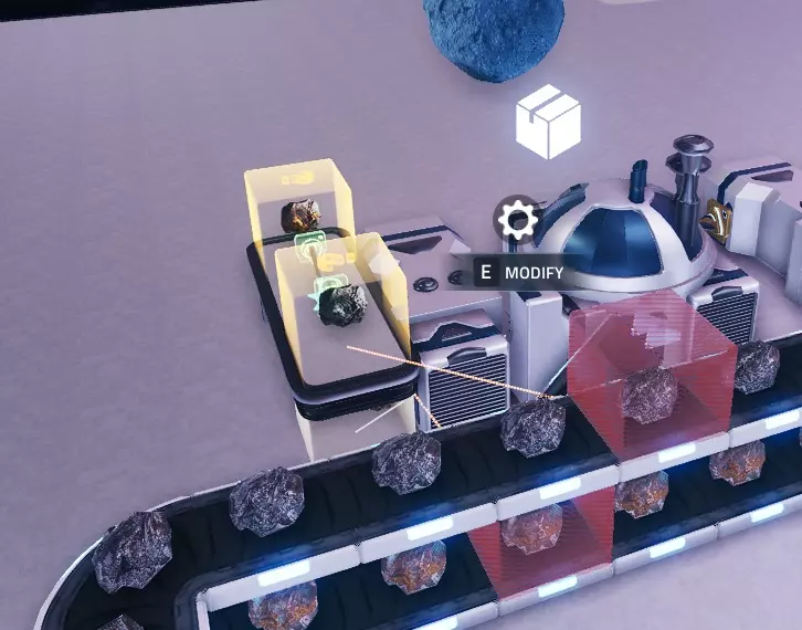 为机器供料 你想要让机器开始工作。 如果你只是想用一种资源为一台机器供料,只需将传送带连接到输入端即可,但要是想为多台机器提供多种输入资源该怎么办呢? 本部分将教你如何实现这一点。 1. 多台机器共用一个输入 为多台机器提供单一输入资源相当简单。 当你对着机器按下E键时,可以点击齿轮图标来配置输入和输出物品的最大数量。将其调低至你想要的数值,一旦机器装满,就不会再接收物品了。