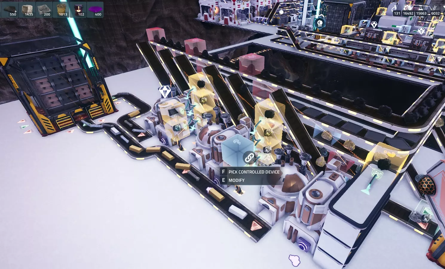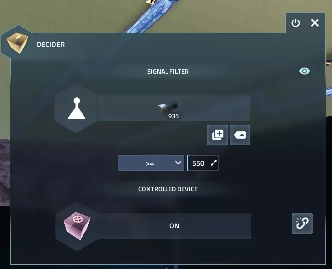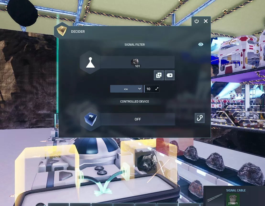 现在要设置决策器,请按E键打开决策器界面,点击信号过滤器下方的【选择资源】按钮,然后选择之前已通过库存传感器选定的物品。如果信号设置正确,将显示该建筑拥有的物品数量。