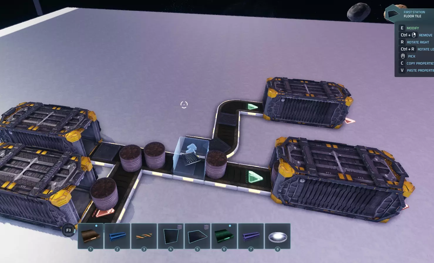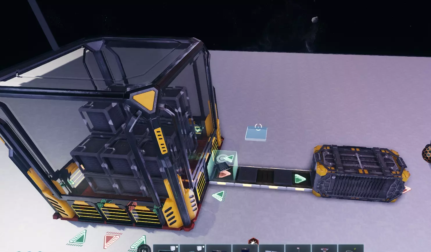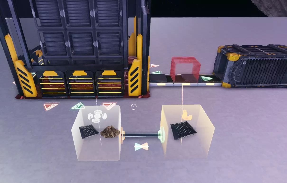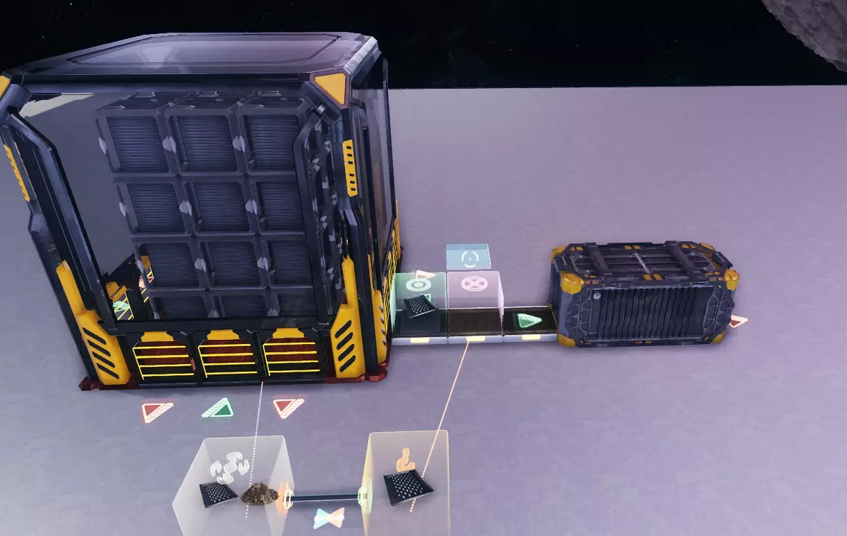 本指南将教你如何在《太空殖民地》中打造一个功能齐全的自动化基地! 前言: 请注意,本指南基于实验性1.0版本,该版本引入了堆叠限制,这使得物流系统更具挑战性,需要你对工厂进行合理设置。 起初使用运输机器人处理物流是可行的,但一旦生产规模扩大,机器人就会因相互阻塞而迅速失效,因此最好尽量避免使用它们,以免后期遇到麻烦。 我们将教你如何使用逻辑模块向机器输送多种输入资源、防止资源溢出以及在基地仓库中储存部分物品。 逻辑模块介绍:我们将要使用的逻辑方块包括推进器、阻挡器、过滤器、分离器、库存传感器和判定器。 我们会对它们进行简要说明,以便你了解我们将要操作的内容。如果你已经熟悉这些逻辑方块,可以跳过此部分。 1. 推进器:该方块会推动物品【仅当】物品能够移动到其指向的位置时。