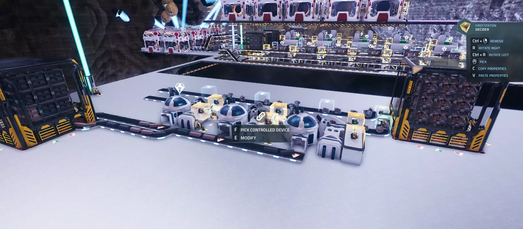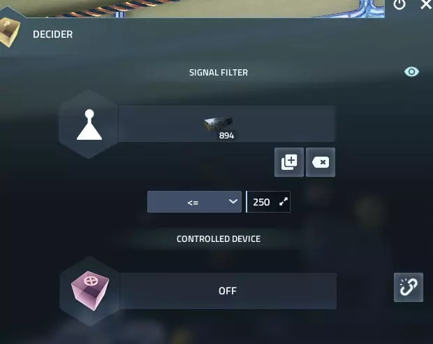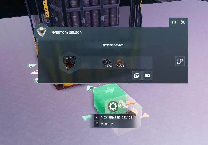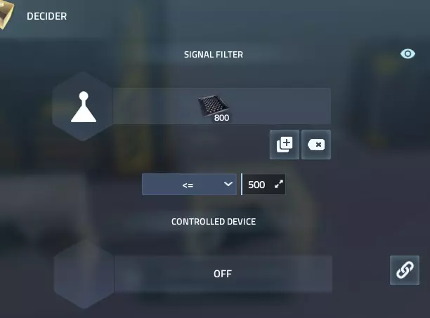 要进行设置,你需要对着库存传感器按E键,然后点击右侧的【选择设备】按钮,再点击你想要从中感应的存储装置或设备。如果选择正确,左侧会显示该建筑的图标。 接着,点击下方的【选择资源】按钮,设置你想要感应的资源。 6. 决策器 由于库存传感器本身不会执行任何操作,所以它通常与决策器配合使用。 要进行设置,你需要用线路将库存传感器和决策器连接起来。