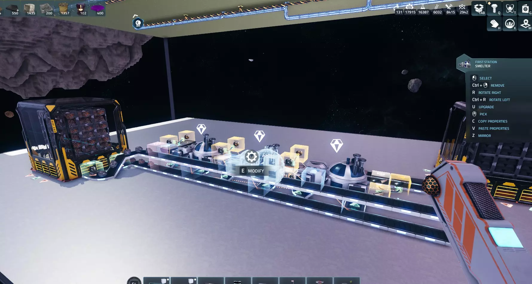 关于库存传感器,点击【拾取设备】并点击熔炉,然后点击【选择资源】来选择输入物品。这里,输入物品将是铁矿石和铜矿石。