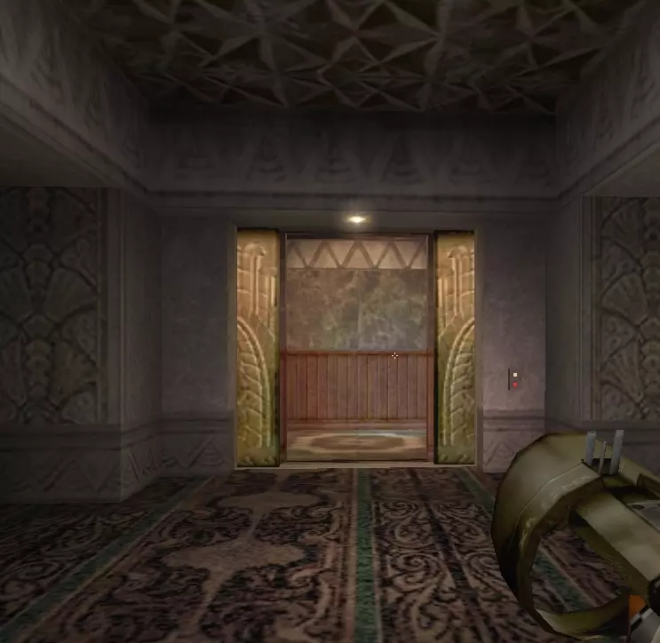 干掉那个家伙,按下蓝色按钮,然后从另一扇门继续前进。