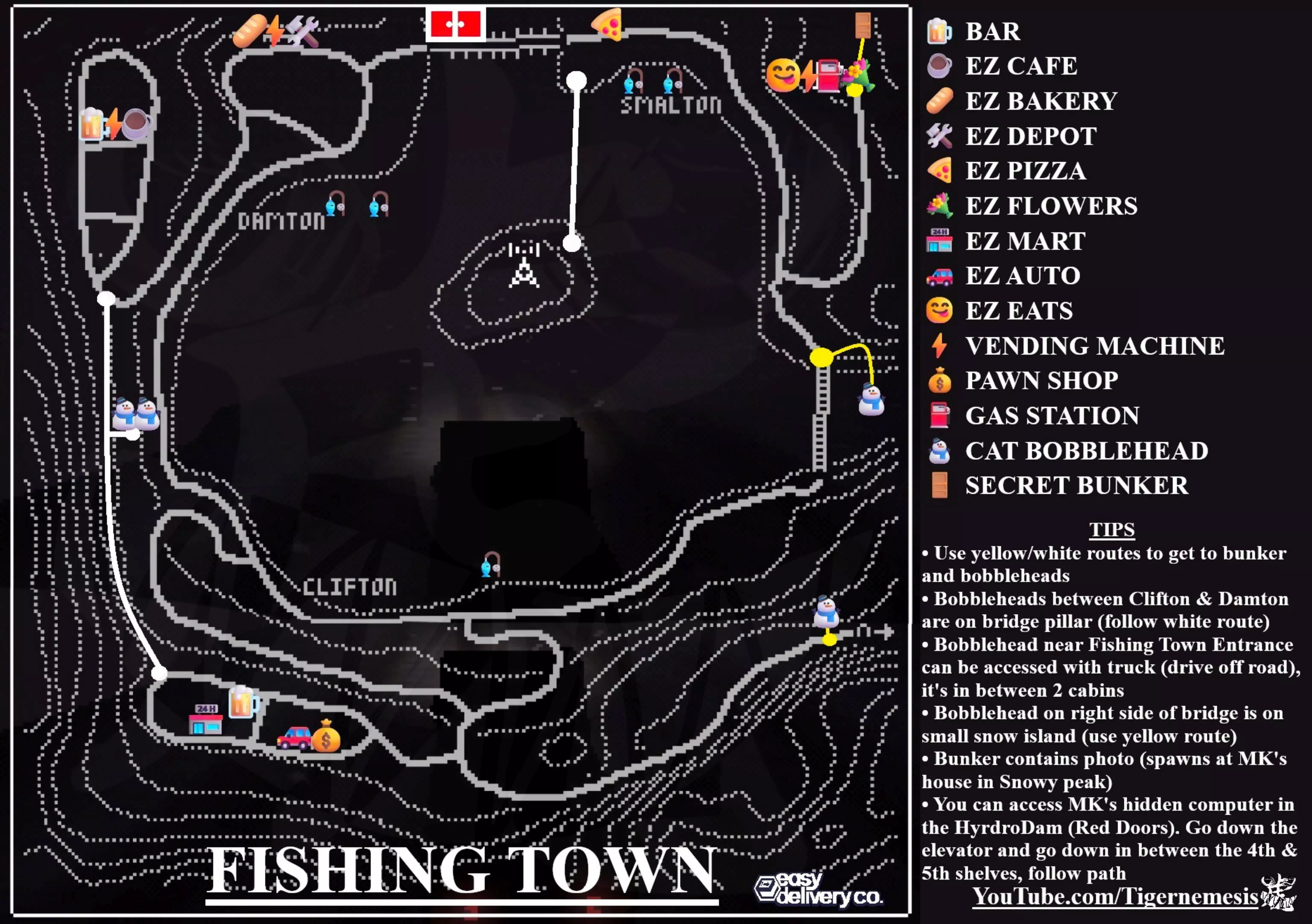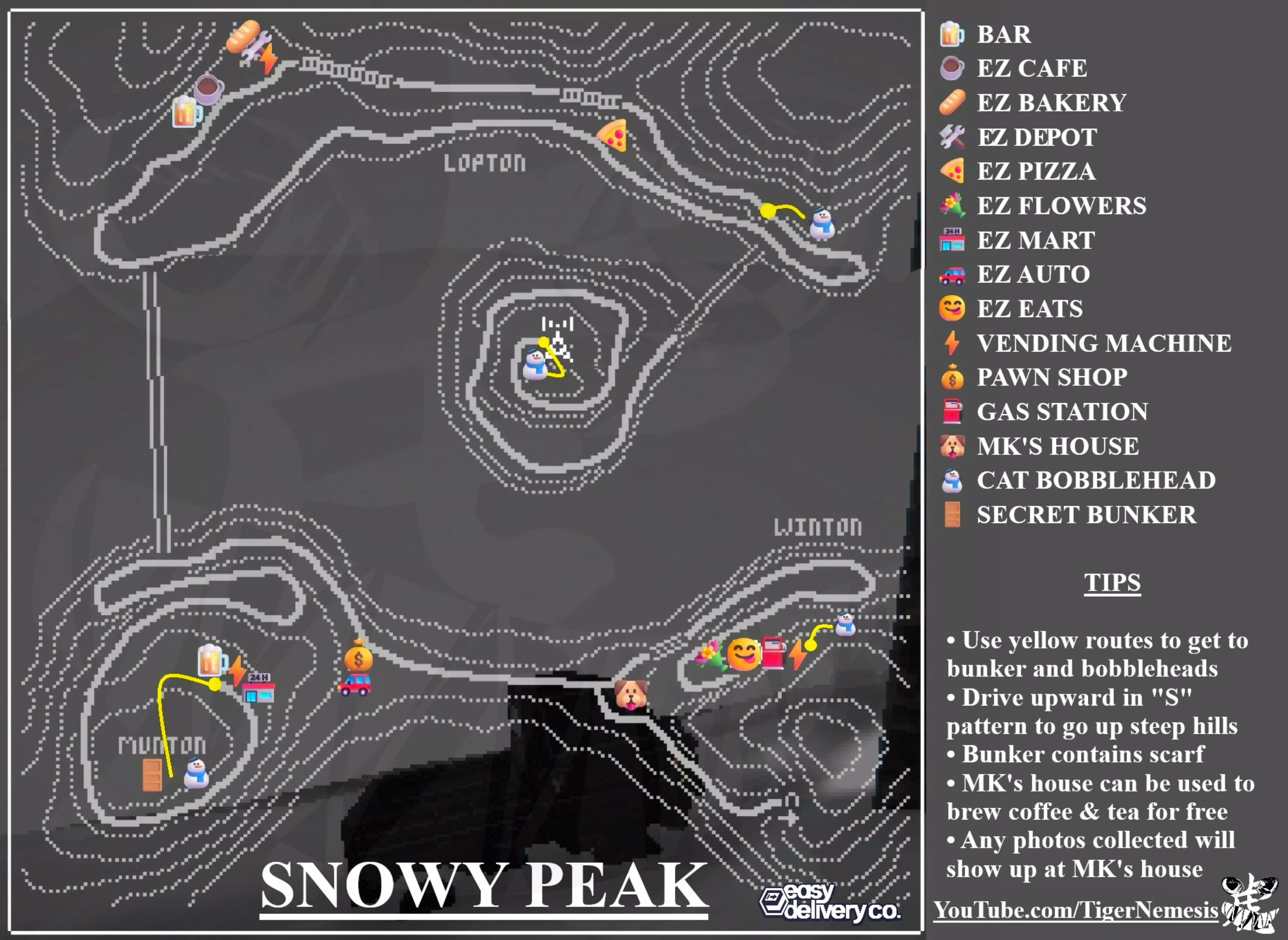 ☃️ 摇头娃娃 ☃️ 山镇 - 5个摇头娃娃 1. 厄普顿 - 起始区域 - 地图上“U”字的左上角 2. 左上角无线电塔 - 紧挨着塔的右侧,道路上方的上坡处【需要雪地胎】 3. 伊斯顿 - EZ披萨店屋顶 - 高楼,必须从上方道路快速跳跃 4. 韦斯顿 - 建筑物之间 - 地图上“WESTON”中的“S”位置【需要雪地胎】 5. 韦斯顿 - EZ仓库顶部 - 从北侧登上建筑物顶部 雪山峰 - 4个摇头娃娃 1. 温顿 - 加油站后面,悬崖边 2. 芒顿 - 酒吧道路尽头后向左上坡,到达顶部后,在掩体入口东侧,靠近边缘【需要雪地胎】 3. 无线电塔岛 - 开车到塔的右侧,右转U型上坡,靠近边缘【需要雪地胎】 4.无线电塔桥北侧出口,前往顶部道路,看到右侧有积雪区域后掉头,从该区域向东行驶【需雪地胎】 渔镇 - 4个摇头娃娃 1. 镇入口处 - 在通过安检门之前,驾车越过天线大楼右侧的围栏,物品位于正下方的两间小屋之间 2/3. 克利夫顿与达姆顿之间 - 克利夫顿的易捷超市西北方向有一条通往达姆顿的积雪道路,沿此路可到达上方铁轨的水泥支柱处【需雪地胎】 4.斯莫尔顿/克利夫顿大桥 - 沿大桥向北行驶,在桥尽头右转掉头,前往小雪岛(注意冰怪)【需要冰链】 地堡(三个地堡均需雪地胎) 山城 - 韦斯顿 - 街对面(北面)“N”字标识附近有建筑物,从这些建筑物后面向北上坡 雪山之巅 - 芒顿 - 酒吧道路尽头后向左上坡,一直走到山顶(靠近地图上芒顿的“n”字标识处)【需要围巾!】 渔镇 - 斯莫尔顿 - EZ鲜花店东北方向 物品 恢复光盘(位置:伊斯顿当铺)【故事相关,秘密结局(#3)】 收音机(位置:水电站内,右上角最后一个架子上)【故事相关】 咖啡粉(6美元)【恢复3格能量,每袋可冲泡3杯(需要 stove 或 bonfire)】[鱼 soup 前的最佳选择] 【茶包】(6.98美元)恢复1格能量,30秒内防止冻结和能量流失 【能量饮料】(4.75美元)恢复1.5格能量,商店和自动售货机价格相同(可回收!) 【木柴】(19.95美元)2个木柴+打火机可制作 bonfire,在附近可防止冻结( stove 需1根木柴) 【胶带】(7.96美元)将货物固定在卡车车厢(无论卡车如何颠簸,包裹都不会掉落) 【鸟食】(7.98美元)喂给乌鸦,它们会返还一些硬币 【鱼 soup】恢复4格能量+防止冻结+15秒内能量不流失 - 用鱼竿在 shack 钓鱼(步行前往 shack,不要开车),在 stove 上烹饪(需要木柴、打火机和锅) 【打火机】(19.99) 烹饪锅(59.99美元) 钓鱼竿(125.99美元,剧情物品) 雪地轮胎(21.99美元) 保险杠(99.99美元) 冰链(199.99美元,剧情物品) 盲盒(每个50美元) 雪峰地区:猫咪棒球帽、羊毛无边帽、卡车用黑/灰色喷漆 山镇地区:蓝色棒球帽、蓝色渔夫帽、卡车用蓝/红色喷漆 渔镇地区:绿色棒球帽、钓鱼帽、卡车用绿/米色喷漆 结局 重启(好结局)- 重启所有店主,清除他们的所有记忆,只有主角和MK保持不变 关闭(坏结局)- 关闭水电站,同时关闭每个店主及其店铺(可以偷取物品但无法购买汽油(若汽车油量低则很危险) 恢复(最佳结局)- 使用恢复磁盘将店主恢复到他们以前的状态